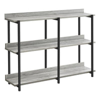 This 3-tier console table steps up when you need a stylish way to proudly display prized possessions. The 2 bottom shelves provide a symmetrical way to arrange decorative items. Above the shelves is a long, narrow tabletop that offers space for placing a small table lamp and a plant, or to rest your keys and mobile devices when you arrive home. Supporting the tabletop and shelf panels finished in grey reclaimed wood-look is a metal base in a contrasting black finish. The sturdy metal frame features bold angles and clean lines for a modern look. With a compact profile and ample display space, this versatile accent table with 3 storage shelves is a great choice for a hallway, an entryway, or behind a sofa in a living room. Additional dimensions: Space between underside of tabletop and top of center shelf: 13.5 inches. Space between center shelf and bottom shelf: 14.5 inches.