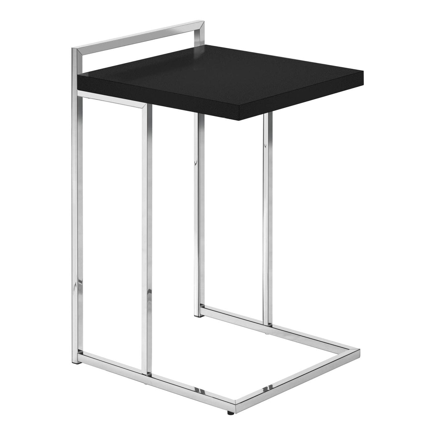 A little more goes a long way with this C-shaped accent table. The tabletop finished in a black laminate is 1.25-inches thick and measures 16 inches L x 17.5 inches W, offering a wider surface than most standard-size C tables. More space means more ways to use this table, which comes in handy if you have limited space and need a side table that can multitask. Use it to keep a remote control and snacks when you watch TV, to rest a book and mobile phone when you go to sleep, and even to hold a laptop or large tablet when you need to work. The chrome metal base slides conveniently under a sofa or bed to bring items closer to you, and offers something extra, too. Additional vertical support bars provide stability, and the top of the frame extends over the tabletop to form a handle that makes it easier to pick up and transport this portable end table.