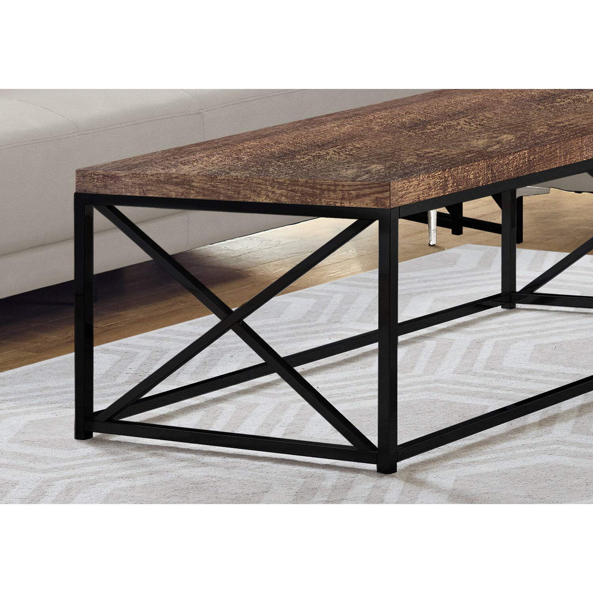 With a grey wood-look surface and a stylish thick paneled design this cocktail table gives an exceptional look to any room. The modern rectangular shape and criss-cross chrome metal base provides sturdy support. Use this multi-functional coffee table to compliment your living room, family room, den or office space.