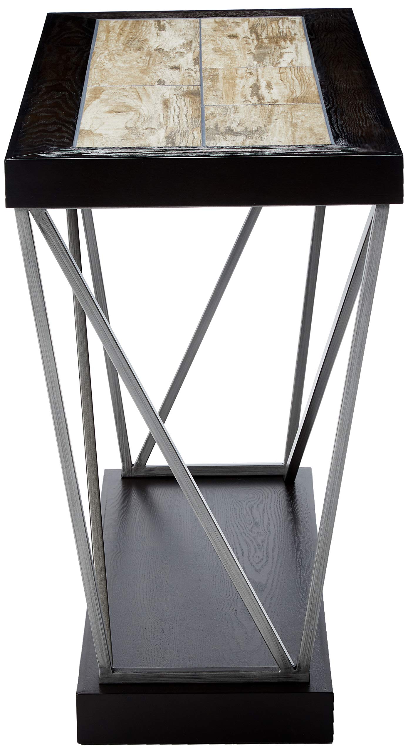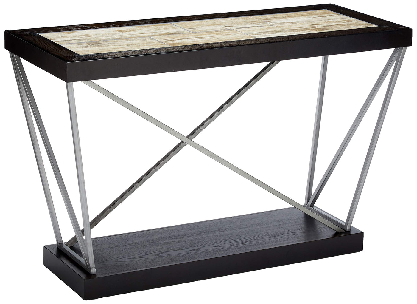Distinctive Ceramic Tile Inlays In Whites, Grays And Tans Create Numerous Design Opportunities For Contemporary Settings. 2” Thick Tops And Bases Of Poplar Finished In A Brown/Black Tone Provide Contrast And Substance. This Table Has A Tubular Metal Leg And Base Structure In A Muted Soft Pewter Color Expand The Decorating Possibilities Of East Bay. Light, Airy Center Sections Add Space And Interest. Full Storage Shelf On This Piece. Ceramic Tile Inserts Highly Resistant To Scratches, Stains, And Wear. Stately 47” Sofa/Console Table. Distinctive Contemporary Design In Mixed Materials For Versatile Decorating.