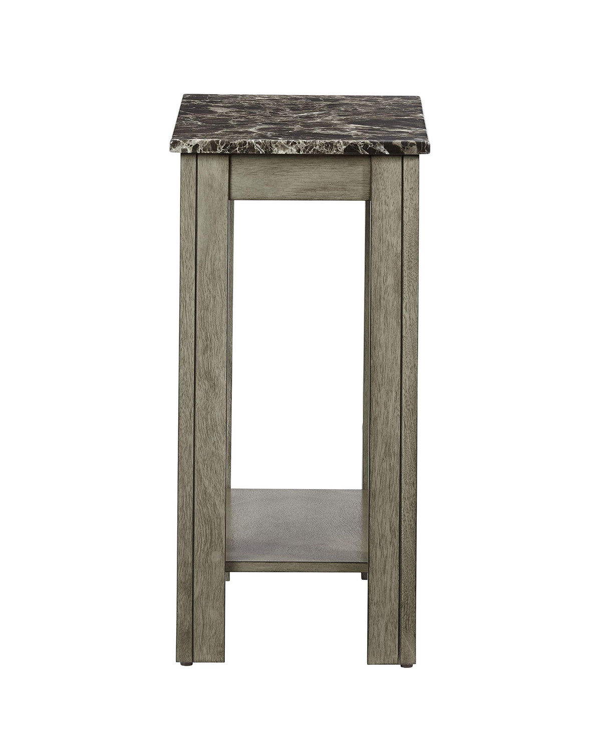 A chairside table in a light gray finish with a contrast faux dark charcoal colored marble top. Perfect to pull up by your favorite chair or better yet, in between two chairs. A simple transitional design with a full bottom shelf for storage or display.