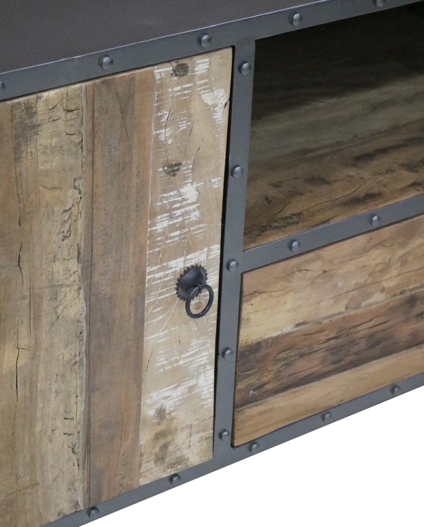 Smart, cool, and functional is key. A transitional style with an industrial feel. Simple, straight-edge, gun metal gray iron frame with contrast reclaimed wood drawers and cabinet. Modern shaped splayed legs introduces a little drama to the mix. Drawers and cabinet made from reclaimed wood adds not only a rustic look but texture as well. A great spacious open shelf provides a perfect area for storage or display. Your living room, bedroom, home office, or wherever you decide to use this chic little number, will never be the same. The matching nightstand (sold separately) is just “icing on the cake”.
