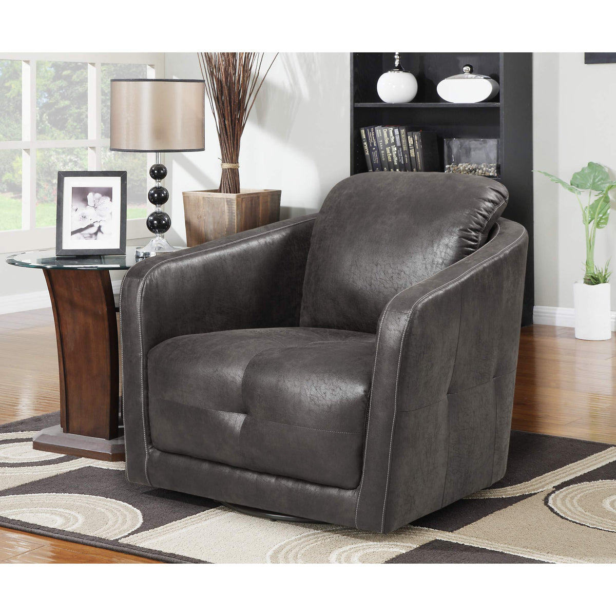 The Butler swivel chairs feature convenient rotational movement and the ultimate comfort of a deep “U” shaped seating experience. With modern slim lines and intricate accented tufting on all sides, this not-so-ordinary chair captivates with contemporary appeal and functionality. The cover is a suede look, easily cleaned polyester fabric, with three color options: sable -45, steel -33, and silt -35. The Butler swivel chairs feature no-sag springs with pocketed coil fixed seating to add extra comfort and durability. The fashionable design and functionality of this unique swivel chair will fit handsomely in any home setting.