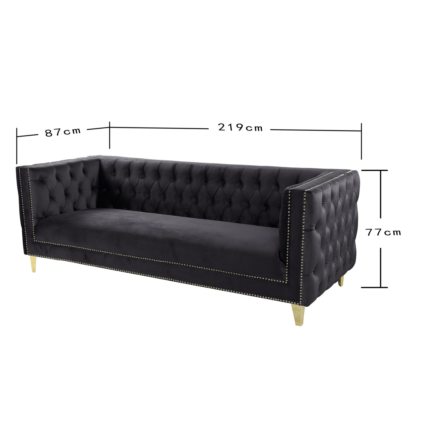 WPFurniture Luxe Velvet Sofa with Gold Legs, Gold Nail head Trim and Button-Tufted Design, Fully Assembled. Create an inviting atmosphere in your living room with this luxurious velvet sofa! Featuring a sleek rich gold nail head trim, button-tufting, and a clean-lined rectangular silhouette and legs with a shiny gold finish and fully assembled, this sofa will bring a touch of sophistication and glamour to any space. The comfortable velvet upholstery offers plenty of seating and is sure to provide a cozy spot for family and friends to gather. Add a touch of luxe to your home with this stunning velvet sofa!