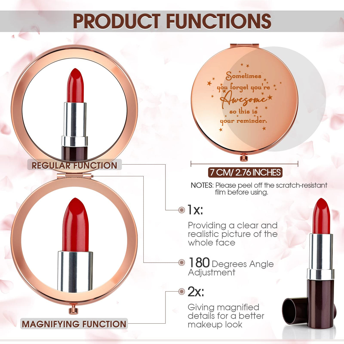 Q: What are the key features of the Roowest Inspirational Compact Mirror?A: The Roowest Inspirational Compact Mirror features a double-sided design with one side for an ordinary reflection and the other offering 2x magnification. It includes an inspirational quote printed using laser technology, making it a thoughtful gift. The mirror is made of metal with a rose gold finish and decorated with diamonds for a stylish appearance.