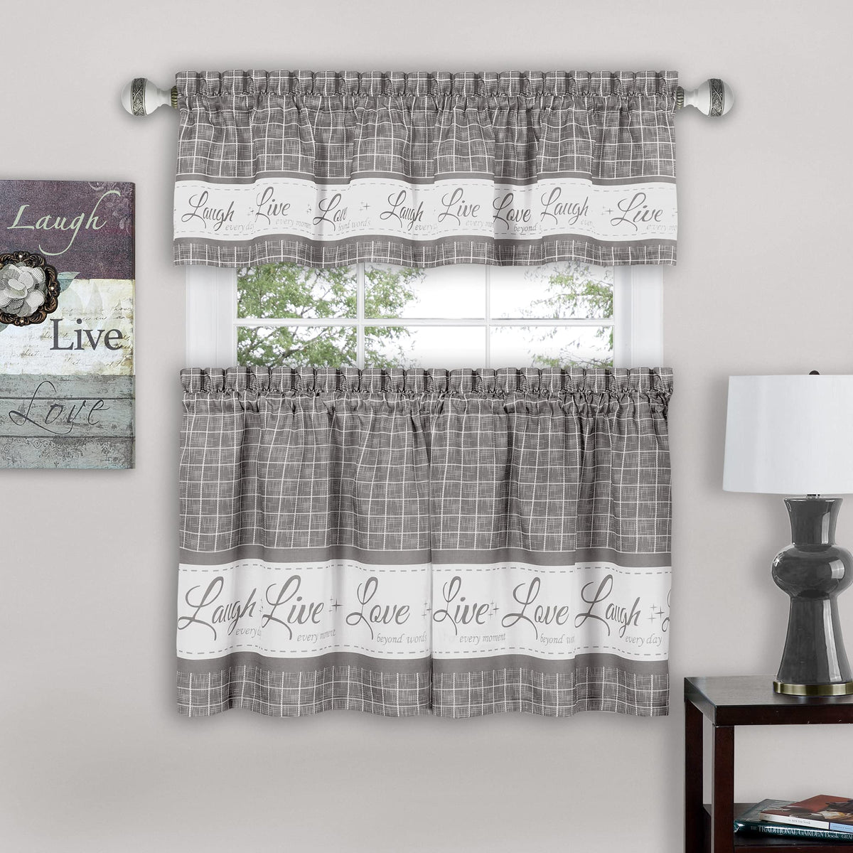 Live, Love, Laugh Tier And Valance Window Curtain Set Composes Beautiful, Printed Words And Printed Woven Plaid, Sure To Inspire Any Room. The Set Includes One Valance And Two Tiers Made Of Machine Washable, Polyester Fabric. Each Piece Has A 1Ǒ Inch Rod Pocket For Easy Installation On Standard Or Decorative Rods Under One Inch In Diameter. Valance Measures 58 Inches By 14 Inches And Is As A Single Piece. Featureslive Love, Laugh Window Curtain Tier Pair & Valance Setspecificationscolor: Greydimension: 58 X 36 In.
