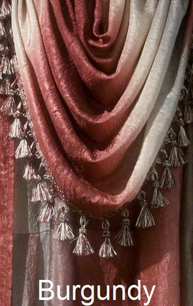 Q: What color options are available for these curtains?A: This particular model features an Ombre design in Burgundy, which complements most decor styles. Matching panels, scarves, and tie-up shades are also available separately.