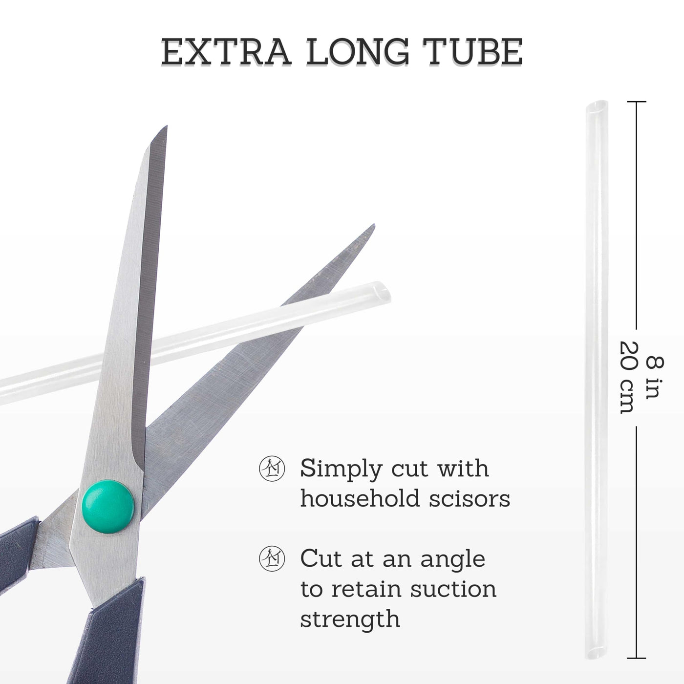Q: Can the tube length of the soap pump be adjusted?A: Yes, the included tube measures 8 inches (20 cm) in length and can be easily cut to the desired length with scissors. To maintain suction strength, it's recommended to cut the tube at an angle.