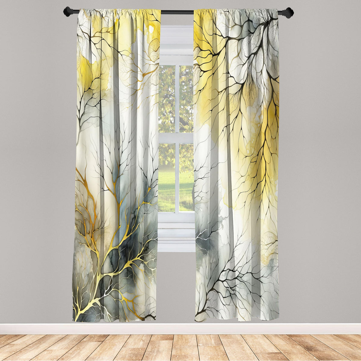 Ambesonne Yellow Window Curtains Pack Of 2, Modern Watercolor Look Backdrop With Leafless Branch Huddle Print Boho, Lightweight Set & Rod Pocket, 4 Panels Of - 28' X 63', Mustard Blue Grey Khaki