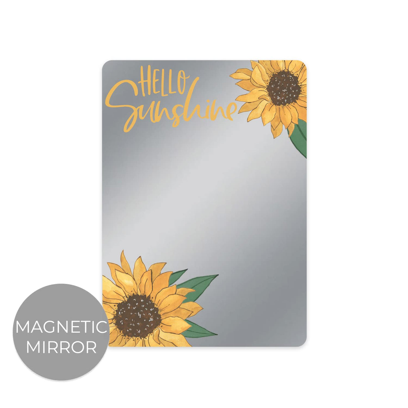 Q: What is the design of the Hello Sunshine Magnetic Mirror?A: The mirror features a vibrant sunflower illustration along with the phrase 'Hello Sunshine,' adding a cheery and stylish touch to any space.