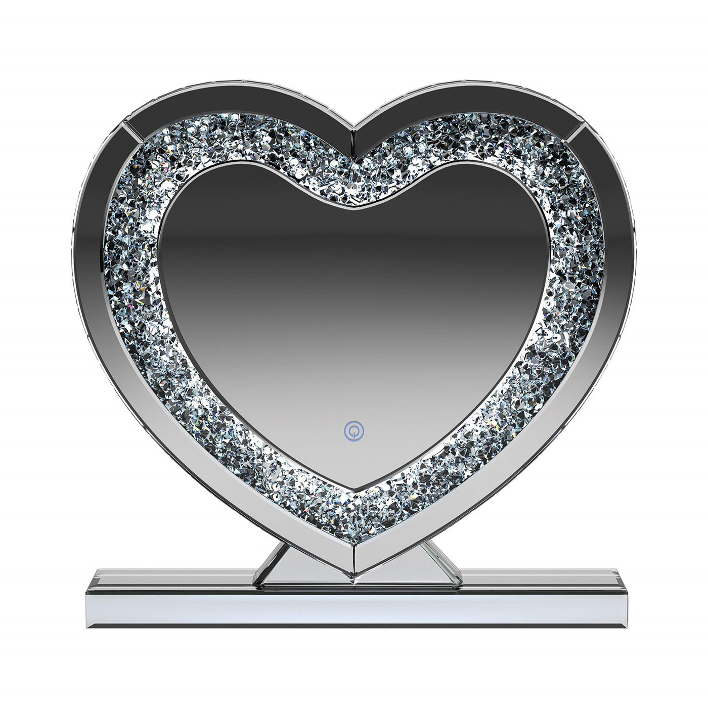 Draw attention to a heart motif with this whimsical table mirror. The heart shape mirror features a silver frame and stand for displaying on a table or shelf. This accent mirror provides sculptural depth when displayed on a bookcase along with other keepsakes. The clear mirrored surface adds a dimensional element that draws the eye. This contemporary mirror could also serve as an artsy accent on a dresser or nightstand.