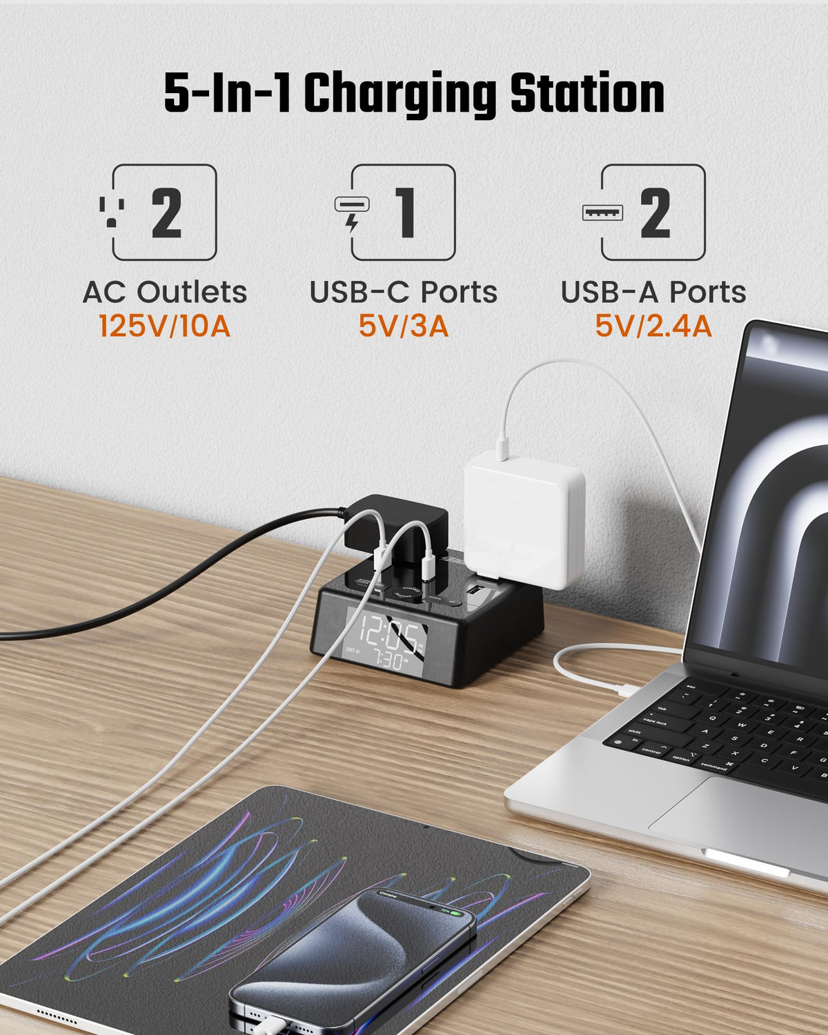 3 Function in 1: This multifunctional device integrates an alarm clock, digital clock, 2 AC outlets, and 3 USB ports, making it the perfect all-in-one solution for your charging and timekeeping needs. Say goodbye to a messy nightstand!