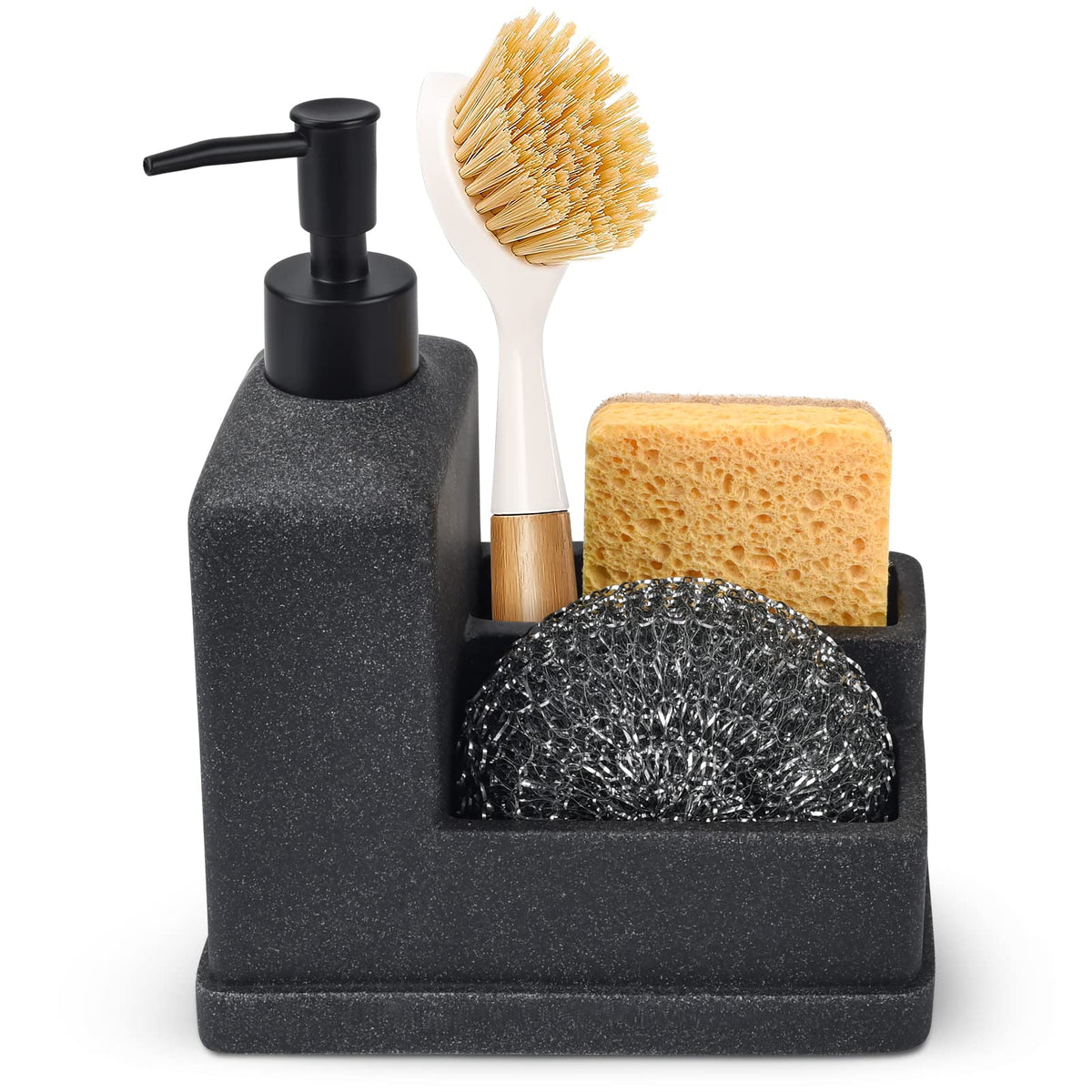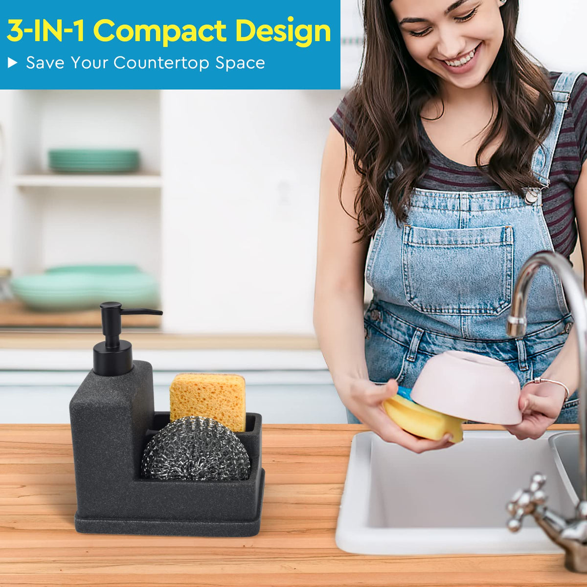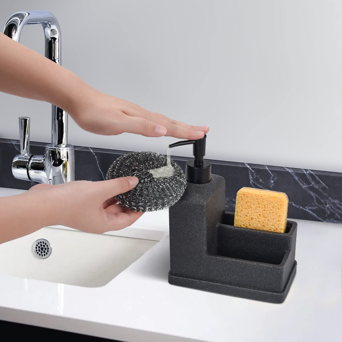 3-In-1 Soap Dispenser With Sponge Holder Our Dish Soap Dispenser With Sponge Holder Is Made Of Nice Resin,It Is Sturdy,Not Break Easily Like Plastic And Easy To Clean. 2-In-1 Design,Keep Your Stuff Together In One Place And Save Space On Your Kitchen Sink,Make Your Life More Easier. Marble Pattern Design,Fit For All Kinds Of Kitchen,Make Your Sink Looks Elegant & Stylish. With Drain Holes,Keep The Sponge And Brush Dry,With Removable Tray Collect The Dripping Water,Keep Your Countertop Tidy And Clean.