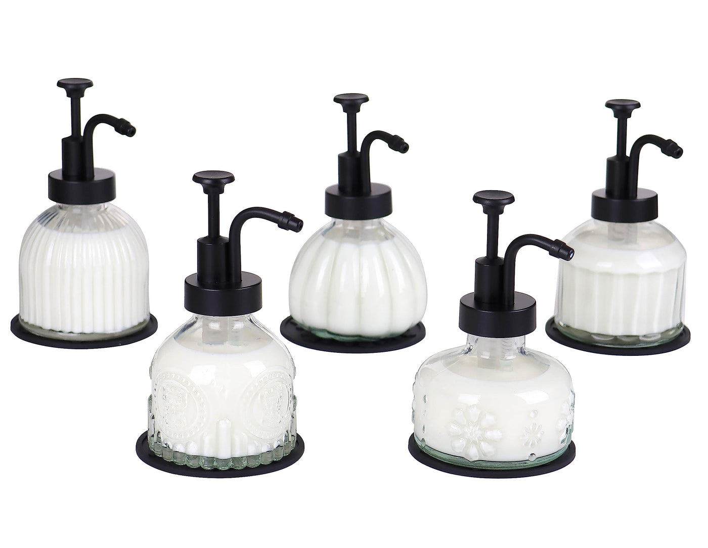 Q: What are the dimensions of the Glass Soap Dispenser?A: The dispenser has mini dimensions of 3.34 inches in diameter and 5.3 inches in height, making it compact and perfect for saving countertop space.