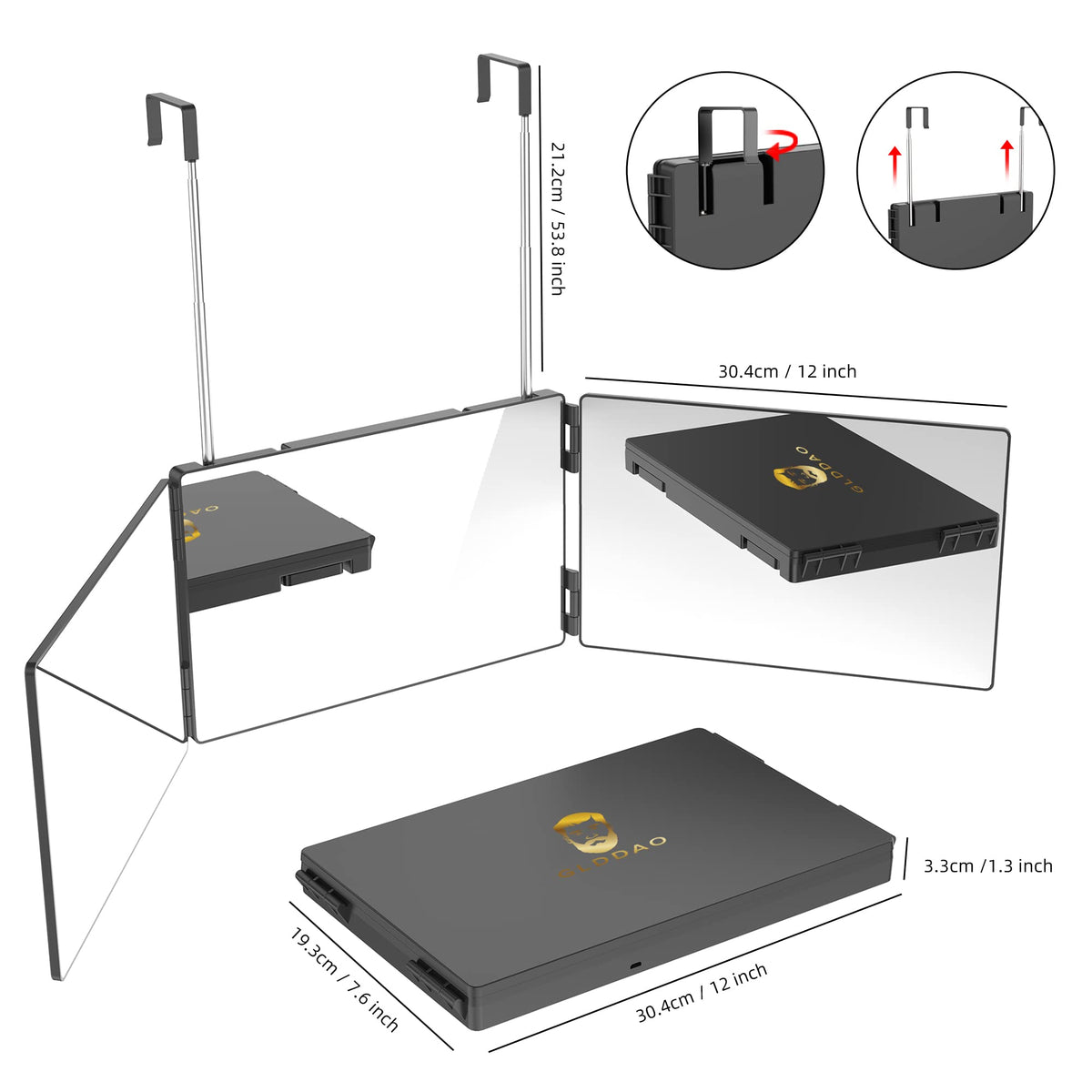 Q: What are the dimensions of the GLDDAO 360 Mirror?A: The GLDDAO 360 Mirror measures 12 inches in length, 7.6 inches in width, and has a thickness of 1.3 inches, making it compact and easy to handle.