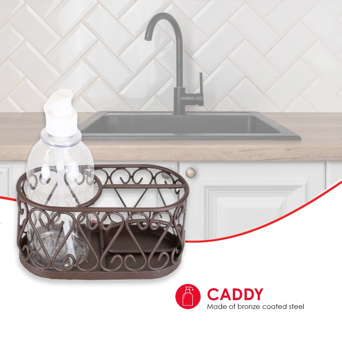 Q: What materials is the soap dispenser and caddy made from?A: The caddy is constructed from durable bronze coated steel, ensuring longevity and a stylish finish that complements various kitchen or bathroom decors.