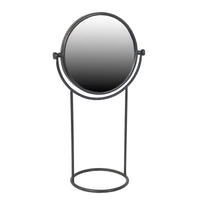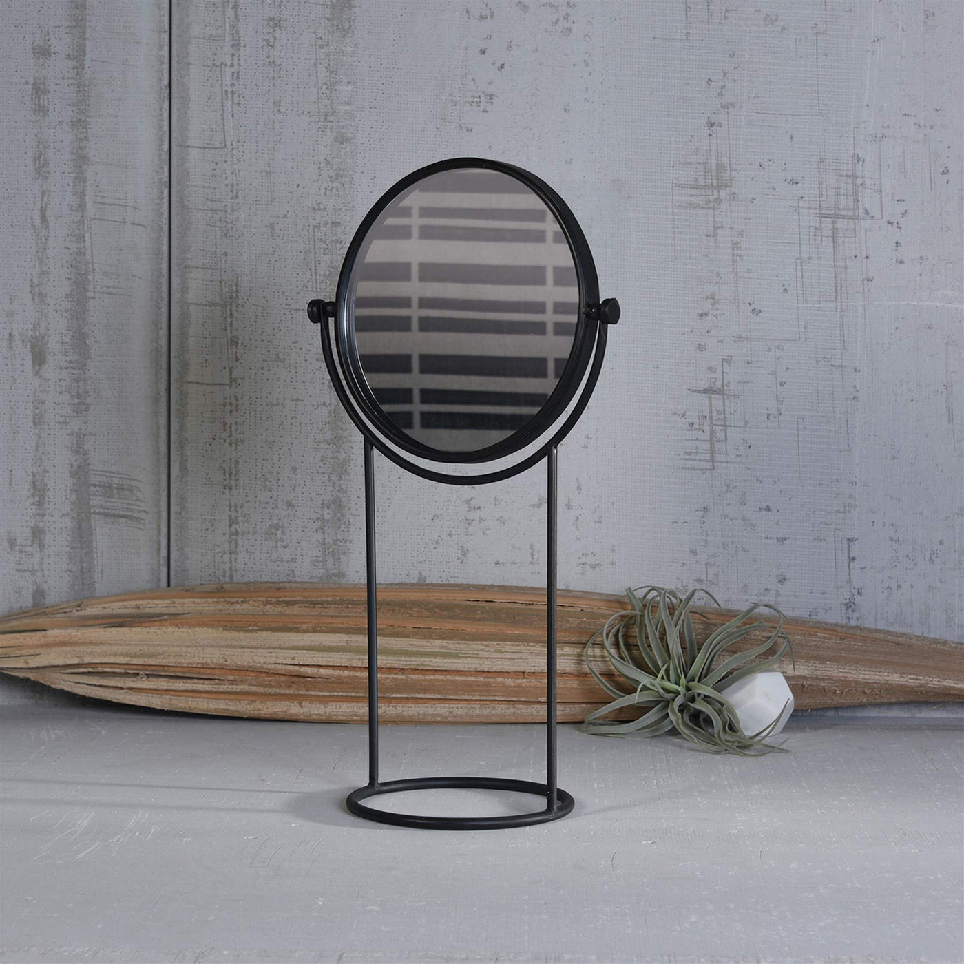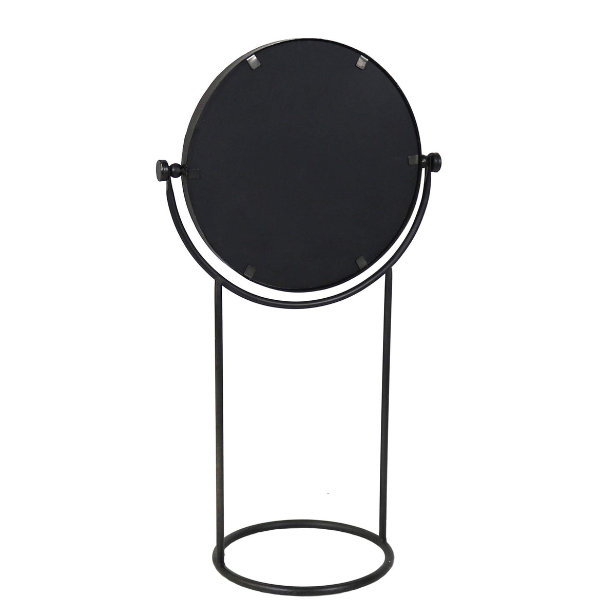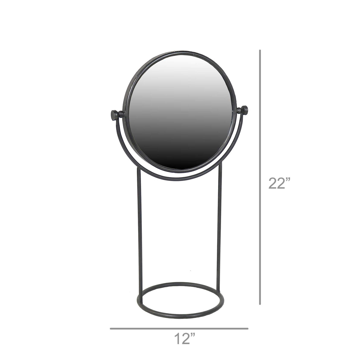 This minimalist styled Black Tabletop Standing Round Vanity Mirror gives you a mirror at just the right height Ideal for desktop or counterop this round mirror stands in a sleek black stand that allows you perfect angle to see your reflection The cool look of this mirror makes it an ideal accent for your room or great gift idea Features. Tabletop makeup mirror with black finish. Round vanity mirrorSpecifications. Color Black. Material Iron Mirror. Shape Round. Dimension 22 H x 8 W x 12 D. Weight 35 lbs