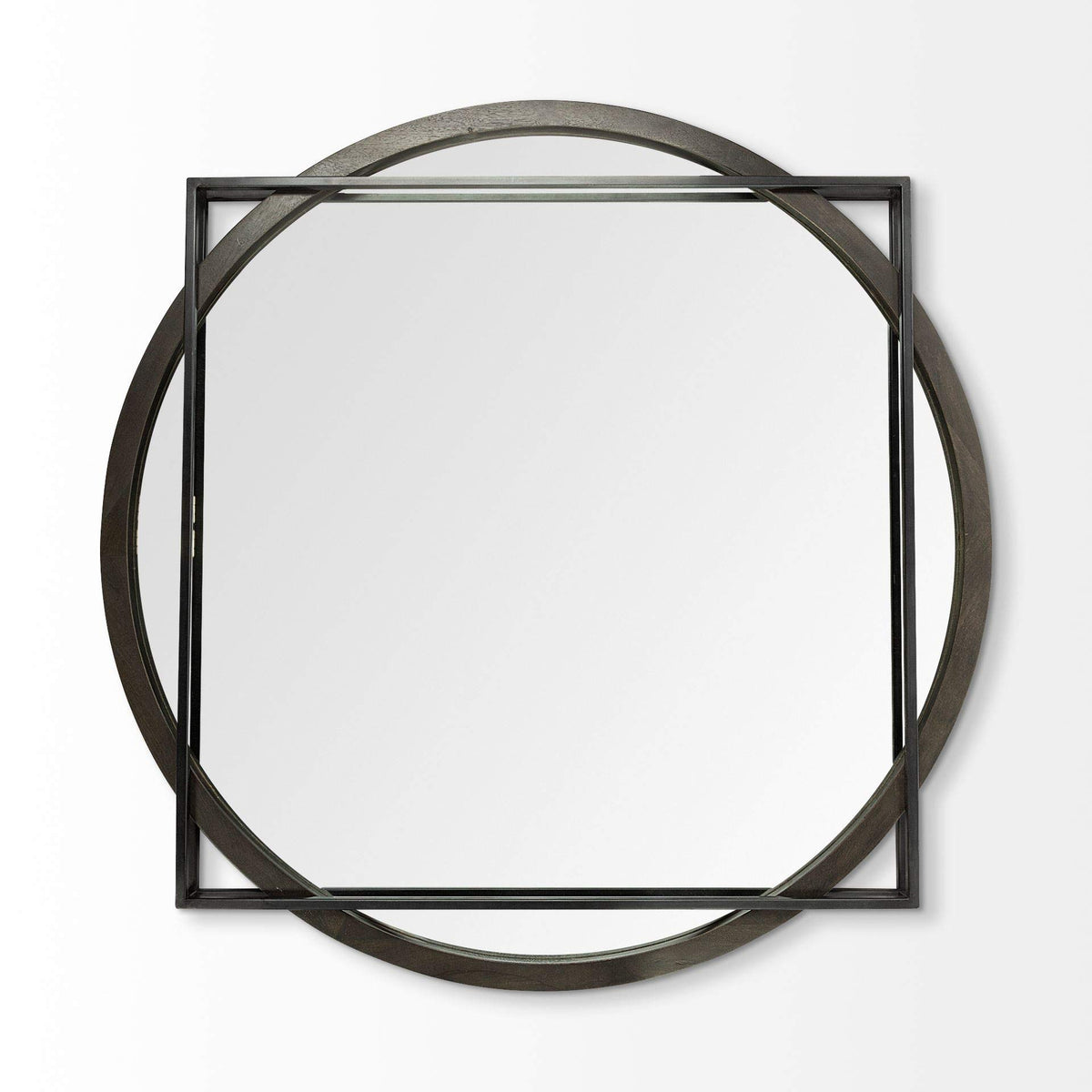 Spectacular mirror with square on a circle profile that will stun guests in your home. The elegant frame holds the mirror in place and adds to the wonder of the design. Add it to your home for a beautiful update. The lovely black finish renders a solid confirmation to its elegance. Features. Combines polished natural wood with matte metal elements, giving it an industrial feel. The smoothly polished dark wood of blends perfectly with the sleek metal frame to surround a shining mirrored glass face. Combining two different overlapping geometric shapes, is a unique piece that is a beautiful addition to spaces based on the Modern or Industrial styleSpecifications. Color Black. Material Metal Wood. Style Modern. Shape Round Square. Height 46 in.. Width 2.5 in.. Depth 46 in.. Country of Origin India. Weight 60 lbs