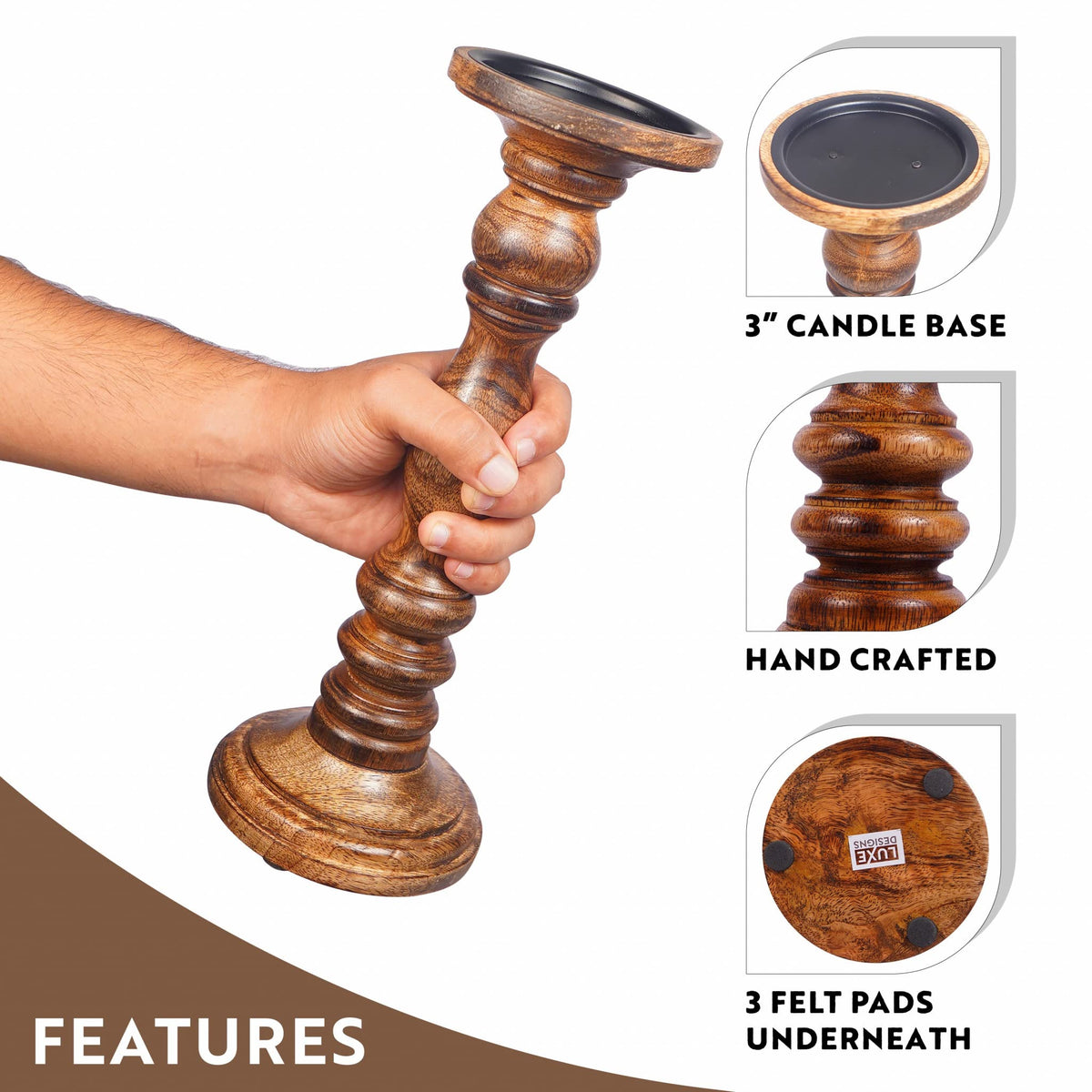 Add a positive touch to your room with this set of three fabulous hand-carved real wood candle holders. This set of three includes a 6, 9, and 12-inch pillar stand, each of which has been hand-carved and passionately detailed by skilled craftsmen. Using eco-friendly real wood, these pieces will display true knots and grains that are the hallmark of authentic mango wood, so no two are exactly alike. The warm brown finish gives these pillar holders a great look that will blend with many decors. Place them together or separately to enhance your space today. Set of 3.