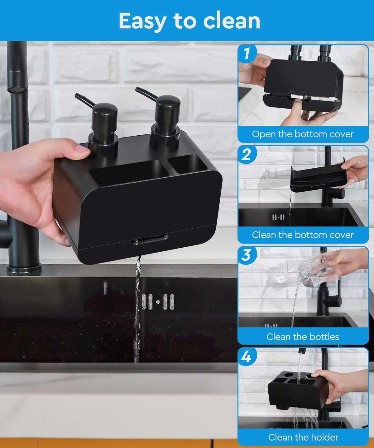 Kitchen Dish Soap And Hand Soap Dispenser Set, Dual Soap Dispenser With Sponge Caddy And Brush Holder 4-In-1 Organizer For Kitchen Sink, Useful Kitchen Gadgets - Black