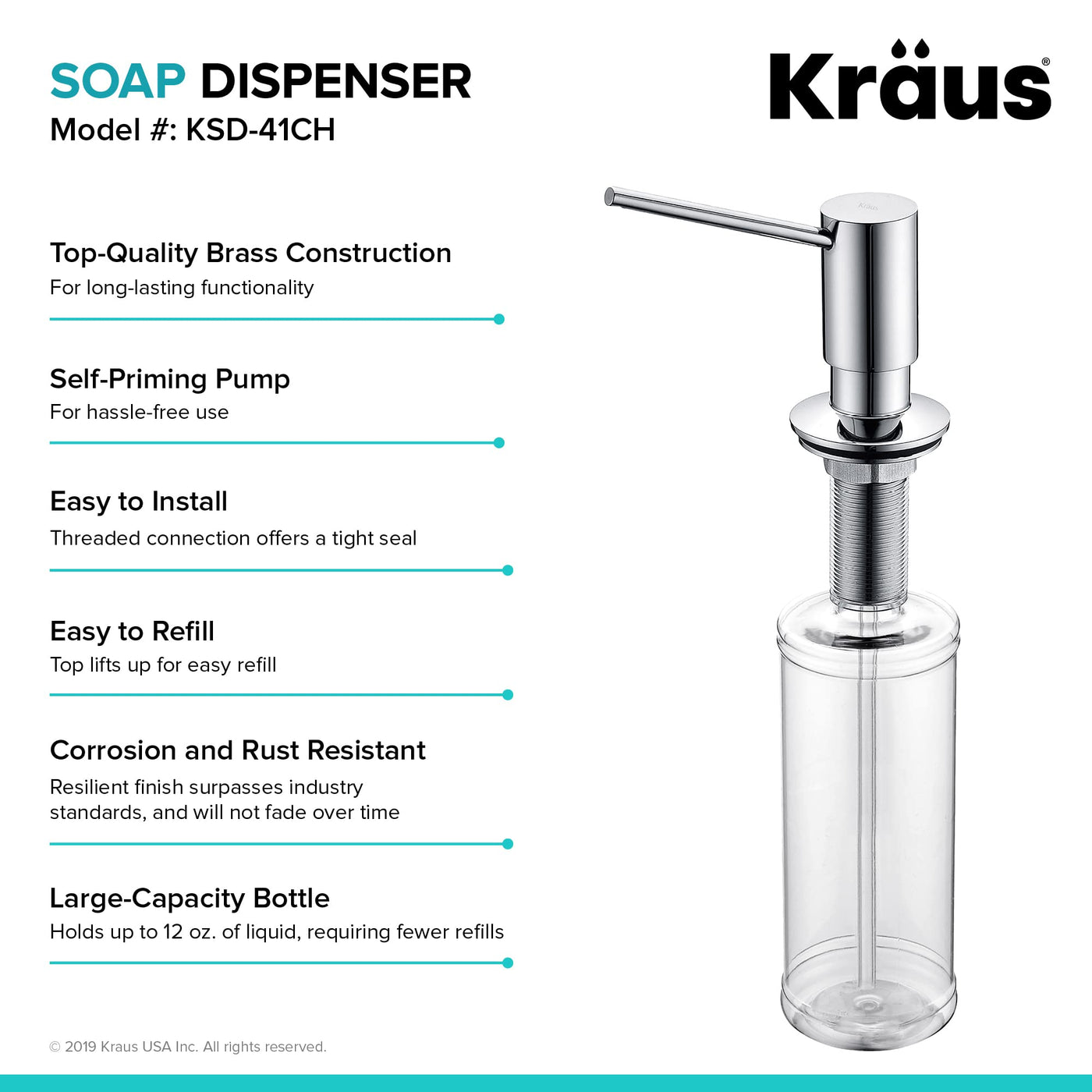 Designed With Clean Lines And Sleek Shapes, Kraus Kitchen Accessories Provide Everyday Efficiency With Style. The Clean Design Of This Soap Dispenser Complements A Range Of Kraus Kitchen Faucets, With A Selection Of Distinctive Finishes That Coordinate Beautifully With Most Popular Kitchen Appliances And Fixtures. The Self-Priming Pump Is Constructed From 100% Lead-Free Brass For Maximum Durability. For Added Convenience, The Pump Swivels 360 And Is Refillable From Above. Experience Kraus Quality, Down To The Details. Soap Dispenser Height (Inches) 3.25, Pump: 3 1/4 Inches,Spout: 3 1/2 Inches