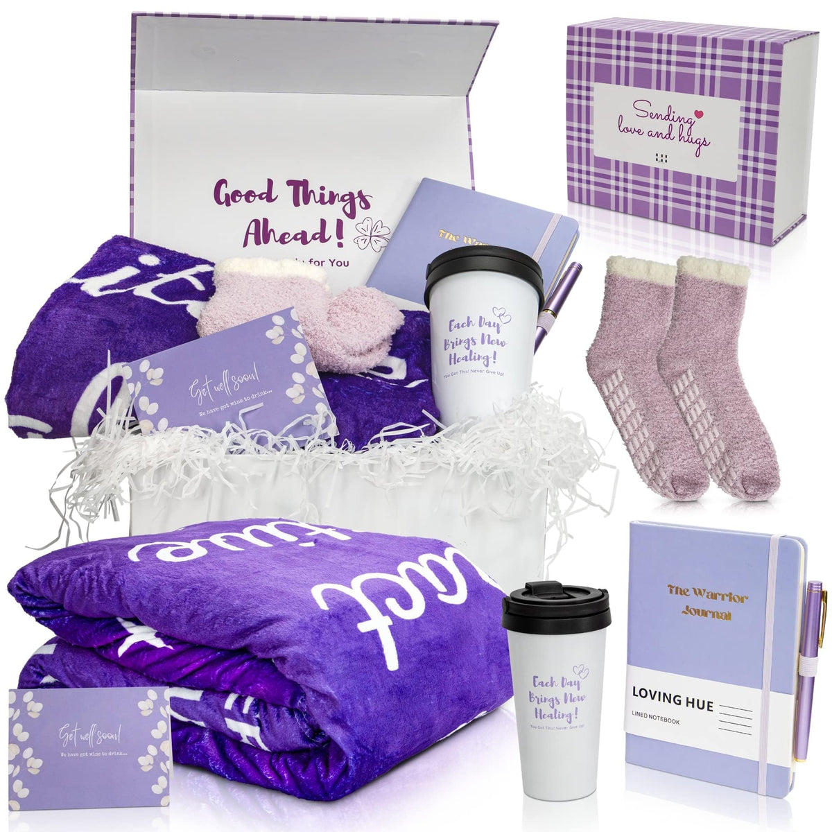 Thinking Of Sending A Get Well Soon Gift Basket To Your Friend Or Loved One Who Is Recovering After Surgery, Fighting Cancer Or Dealing With Chemo?Introducing Our Get Well Soon Care Package For Women Who Are Fighting Cancer Or Going Through Chemotherapy. This Specially Curated Care Package Is Designed To Bring Comfort And Support To Those Going Through A Challenging Time. Each Item In The Package Is Chosen To Help Women Feel Better Physically, Emotionally And Mentally.This Care Package Includes A Variety Of Items To Help Ease The Symptoms Of Chemotherapy Such As Fatigue, Feeling Of Anxiety And Dry Skin. The Package Includes A Cozy And Soft Blanket To Keep Warm And Comfortable During Treatment, A Pair Of Non-Slip Fuzzy Socks To Walk Around Comfortably, A Travel Tumbler For Hot Or Cold Beverages To Hydrate And Provide Nourishments, A Journal And Pen To Help Women Express Their Feelings And Emotions, And A Coloring Section In The Journal To Help Keep Their Minds Active During Treatment.