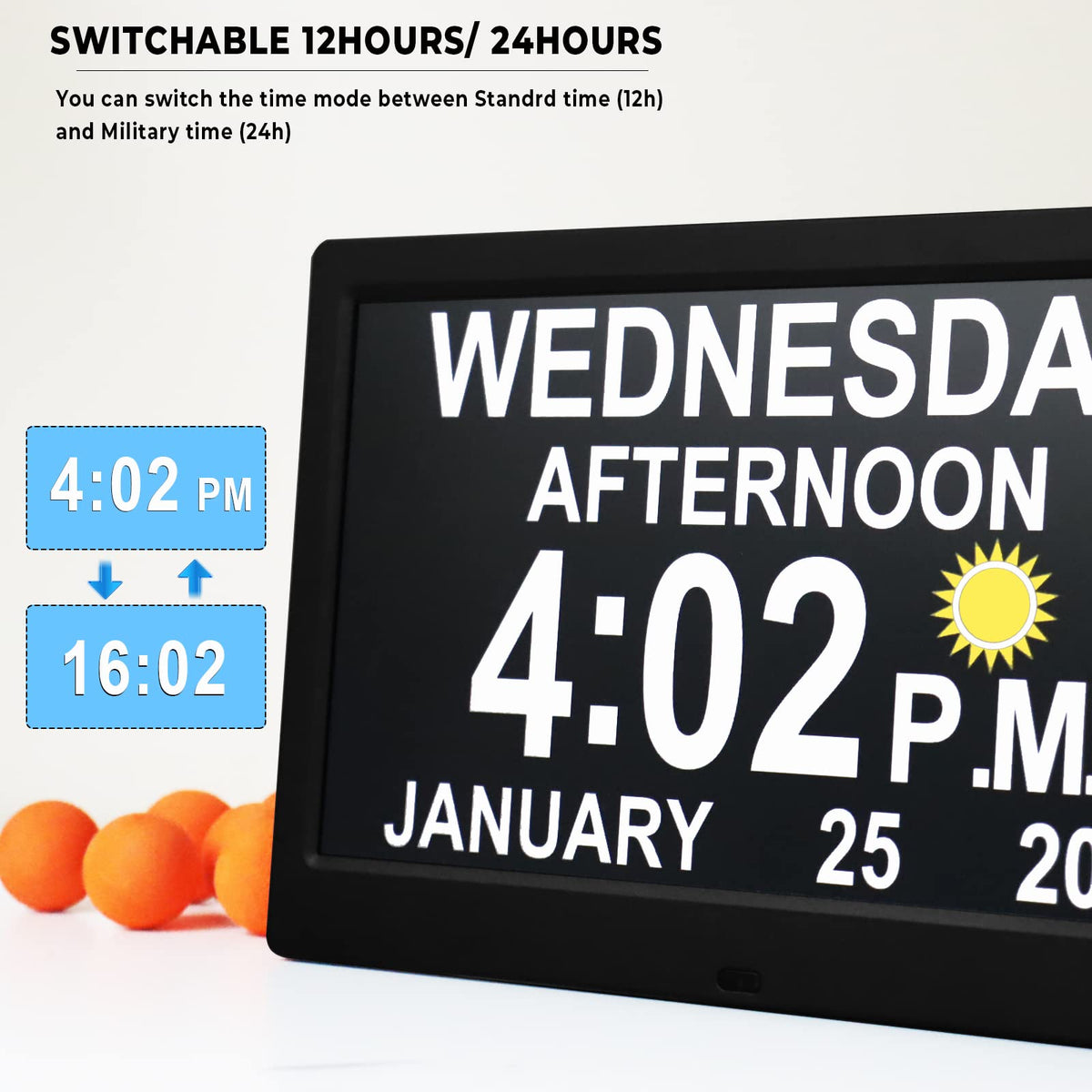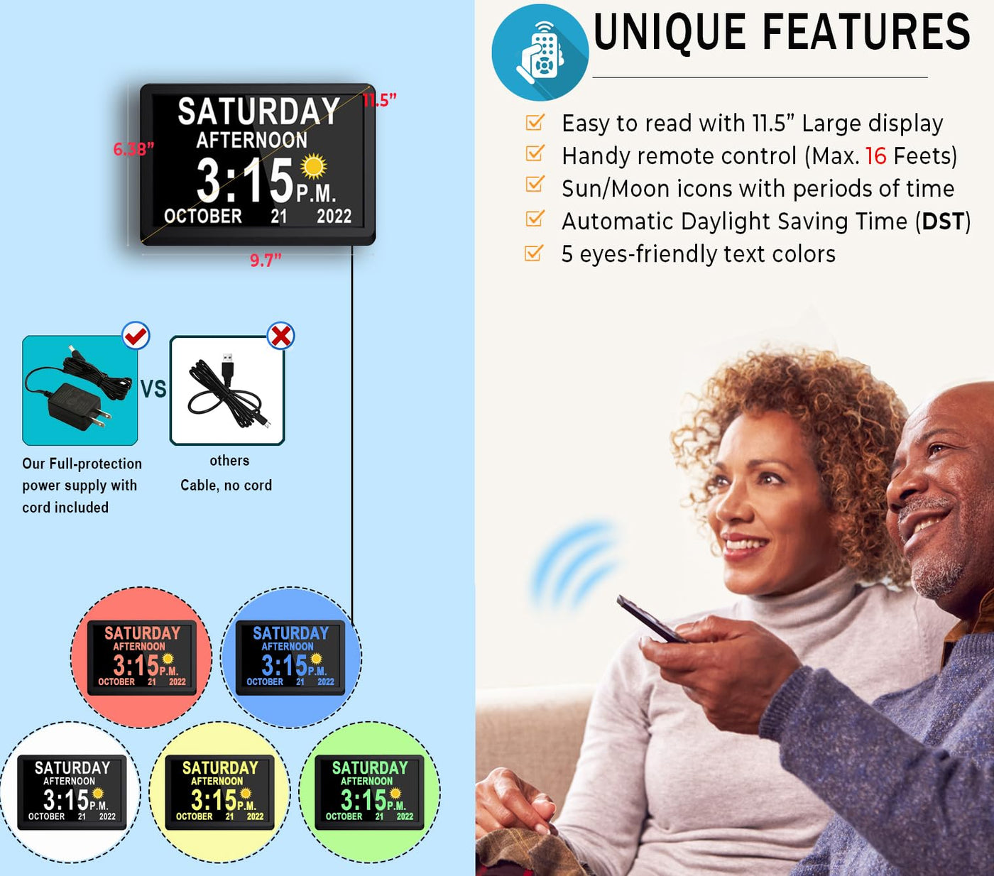 2023 Newest Digital Day Clock For Seniors And Schoolkids This 11.5 Inch Digital Clock With Date And Day Of The Week Is Purposedly Developed To Help The Elderly People Or School-Age Kids With Trouble Of Reading Regular Clocks, Visually Impaired, Alzheimers' And Dementia; Or Setting Up Reminders For Them To Accomplish Their Daily Tasks. Our Digital Calendar Clock Has The Features Of Colored Sun/Moon Which Cycle From Time To Time To Indicate Periods Of Day.Besides, The Clock Has Several Preloaded Reminders Like Medicine-Taking, Drinking Some Water, And Alarm Timings Clearly; Users Can Also Custom Extra 15 Reminders (Usb2.0 Drives And Computer Required) When They Need Personal Reminders. More Features: 1. Auto Daylight Saving Time Adjustment The Digital Clock Can Adjust The Time Automatically When It'S Daylight Saving Time, You Can Switch It Off If You Don'T Need. 2.Remote Control-Up To 15 Feets While You May Adjust The Clock With Keys On The Backside Of The Clock, You Can Also Use The Remote Control To Operate As Well, A Great Aid When The Clock Is Too Far To Reach ! 3.More Fonts Colors Not Just White Font Which You Can Discover On The Other Clocks, Our Clock Has 5 Colors Which Has Warm Lights And Different Contrasts ! 4.More Themes Can Be Teaching Clock