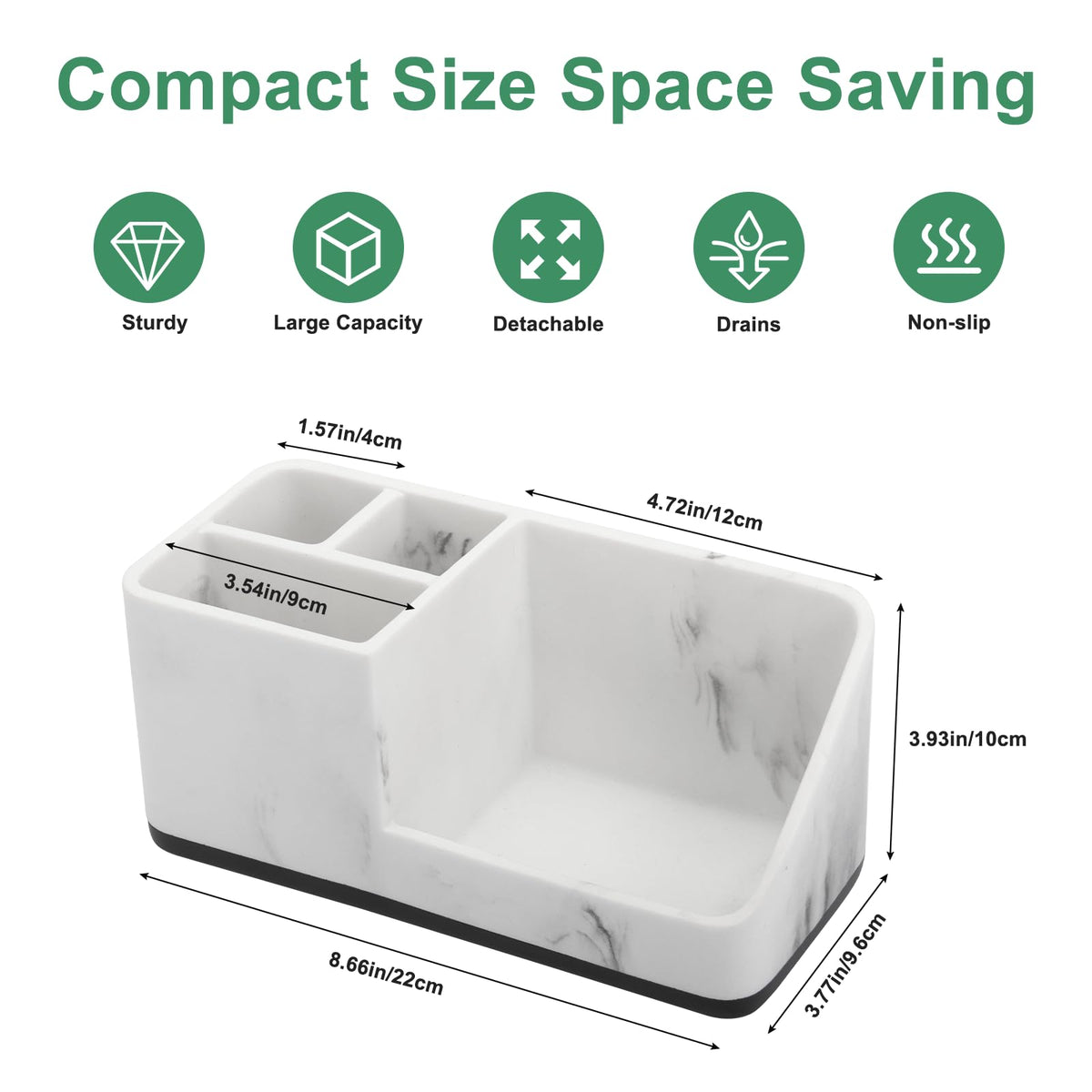 Parkmani Toothbrush Holders For Bathrooms Our Marble Bathroom Counter Organizer Are Made Of Quality Plastic Material, Very Sturdy. Bathroom Organizers And Storage Can Not Only Be Used As Bathroom Organizers, But Also As Makeup Brush Organizers, Pen Holders, Knife And Fork Organizers And So On. Our Bathroom Organizers Countertop Has A Variety Of Colors To Choose From, Very Beautiful, And It Can Also Decorate The Bathroom Countertop While Achieving The Storage Function. You Can Match It According To Different Needs! Features: Compartmentalized Design For Bathroom Organizer Enough To Hold Bathroom Accessories Such As Toothbrushes, Toothpaste, Razors, Facial Cleansers, Mouthwash And Other Items Of Different Sizes. Bathroom Sink Organizer Bottom Drain Design Can Be Drained At Any Time, To Avoid The Bottom Of The Toothbrush And Toothpaste Moisture, Keep Dry And Tidy. The Bottom Of The Bathroom Organizers And Storage Comes With Raised Rubber Anti-Slip Strips, Which Can Better Prevent Falling And Won'T Scratch The Desktop.