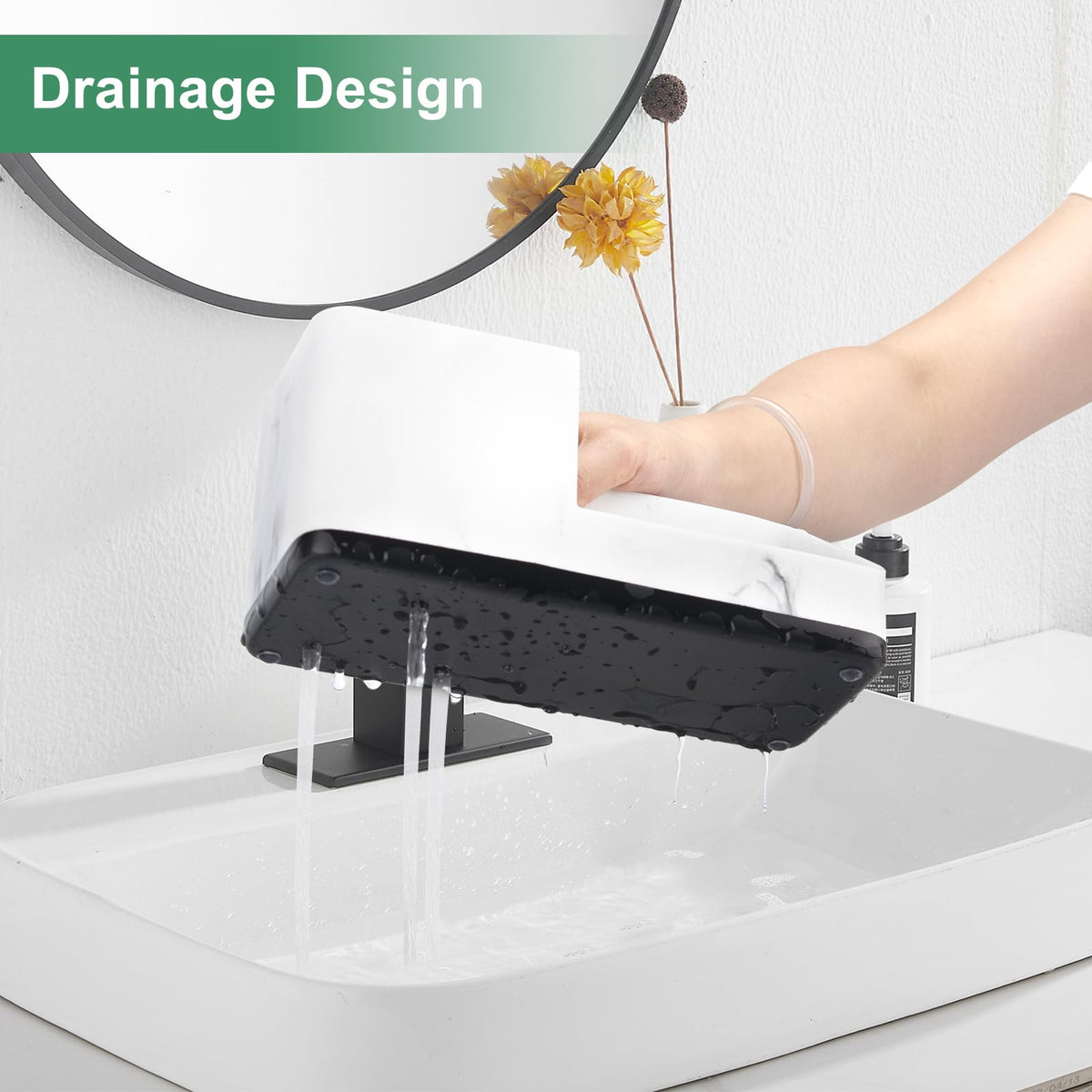 Q: How does the non-slip drainage design work?A: This organizer features 4 rubber pads on the bottom and 3 drainage ports. The rubber pads prevent slipping, while the drainage holes help to keep the area dry by allowing any moisture to escape.