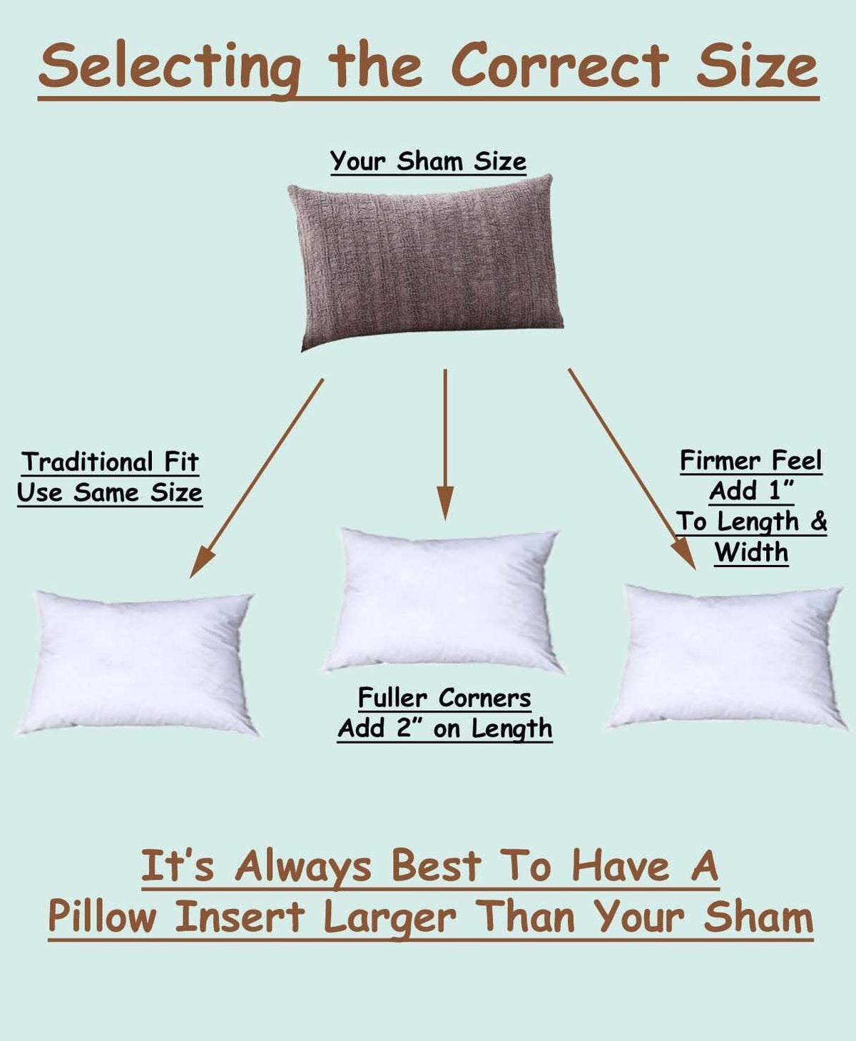 Q: How do I choose the right size pillow insert for my sham?A: To ensure a full and plump appearance, select a Pillowflex insert that is larger than your sham. Refer to the sizing chart provided with the product images for optimal fit recommendations.