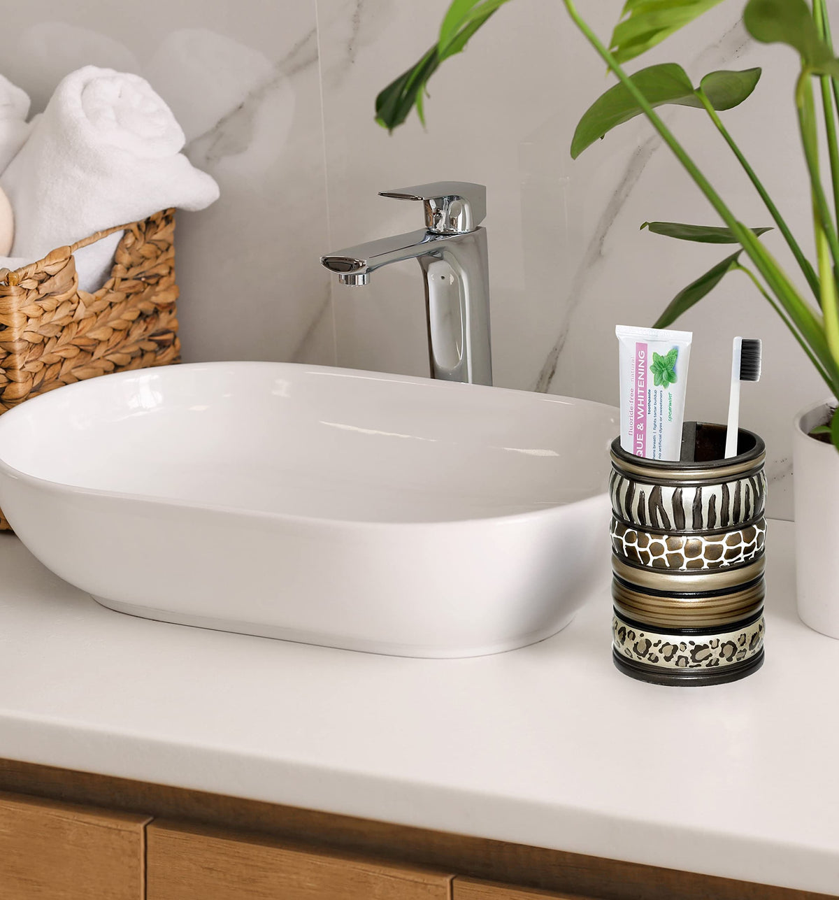 Q: What material is the Popular Bath Safari Stripes Tooth Brush Holder made of?A: The Popular Bath Safari Stripes Tooth Brush Holder is crafted from durable resin material, ensuring a long-lasting addition to your bathroom décor.