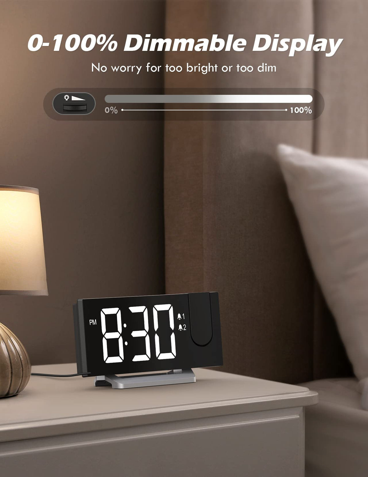 Q: What are the unique features of the Projection Alarm Clock?A: The Projection Alarm Clock features a large LED display with adjustable brightness (0-100% dimmer), a built-in projector to display the time on your ceiling, dual alarms with customizable sounds, and a USB charging port for convenience.