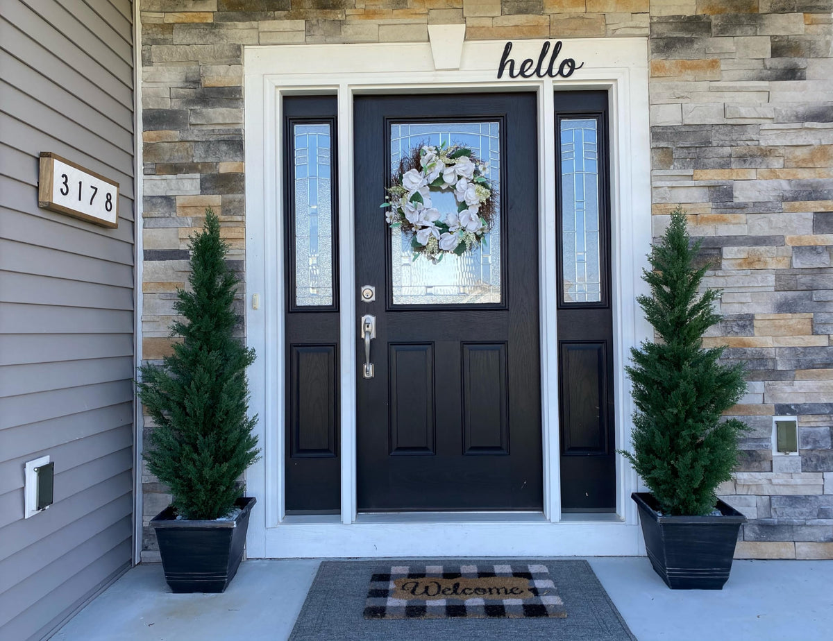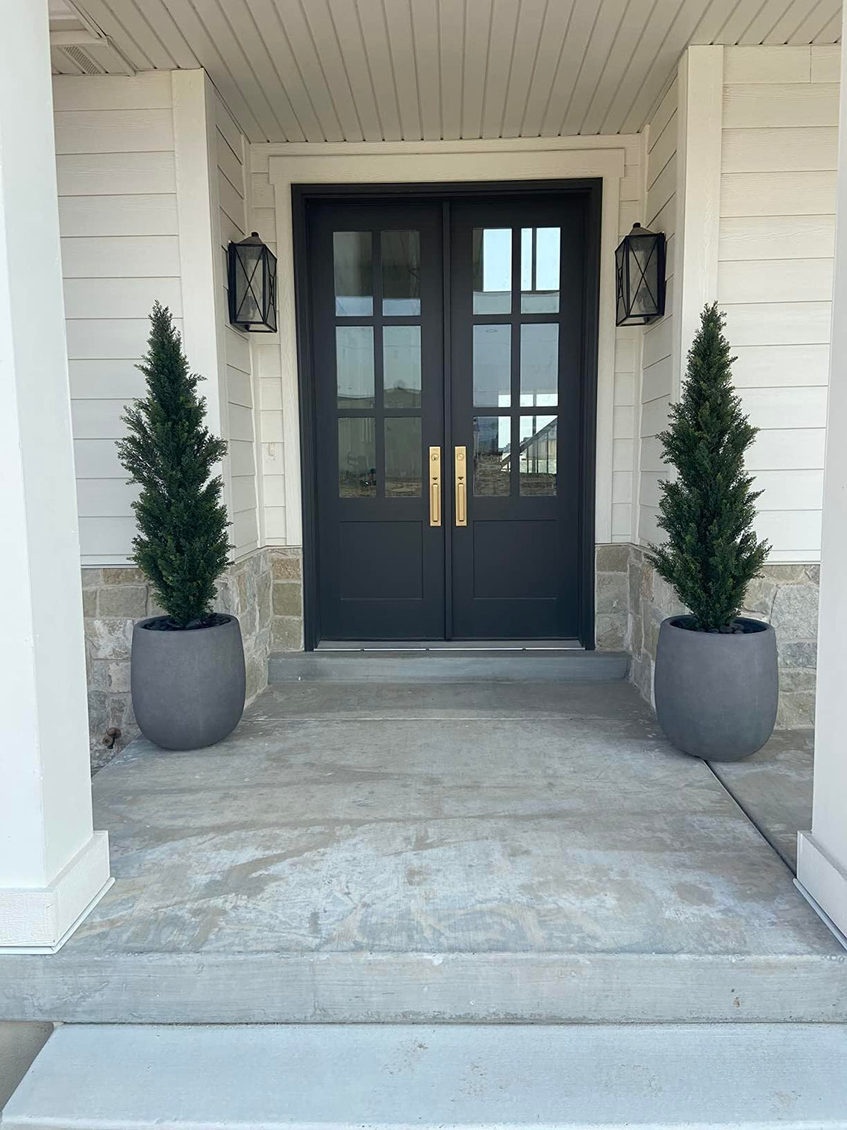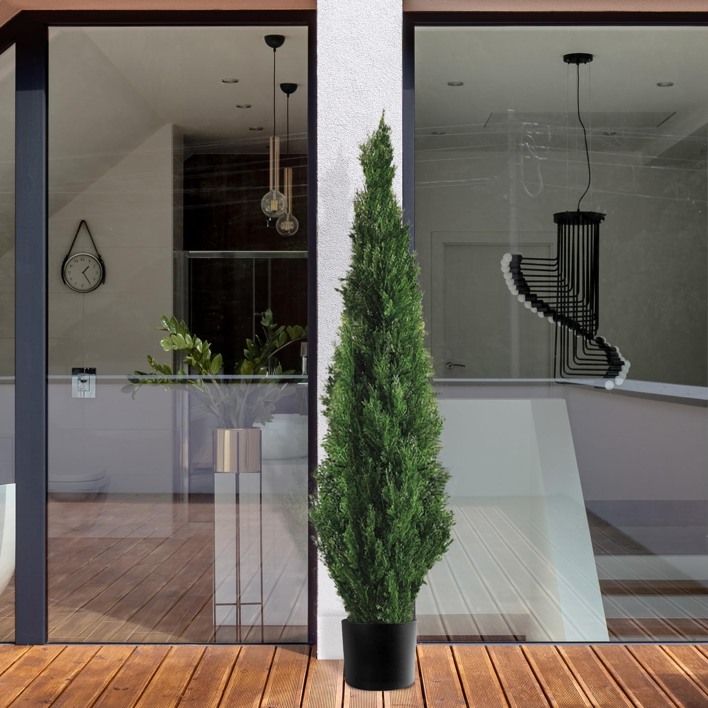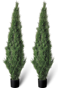 Q: What are the dimensions of the faux cedar trees?A: Each faux cedar tree stands at 5 feet tall, making them perfect for enhancing the beauty of your porch or entryway.