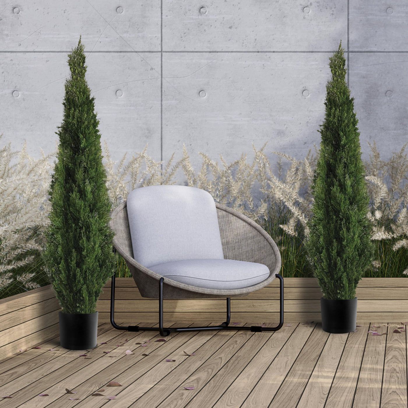 Q: What kind of planter do these trees come in?A: The faux cedar trees come in a stylish black planter that complements various home decors and adds a chic touch to your outdoor or indoor spaces.