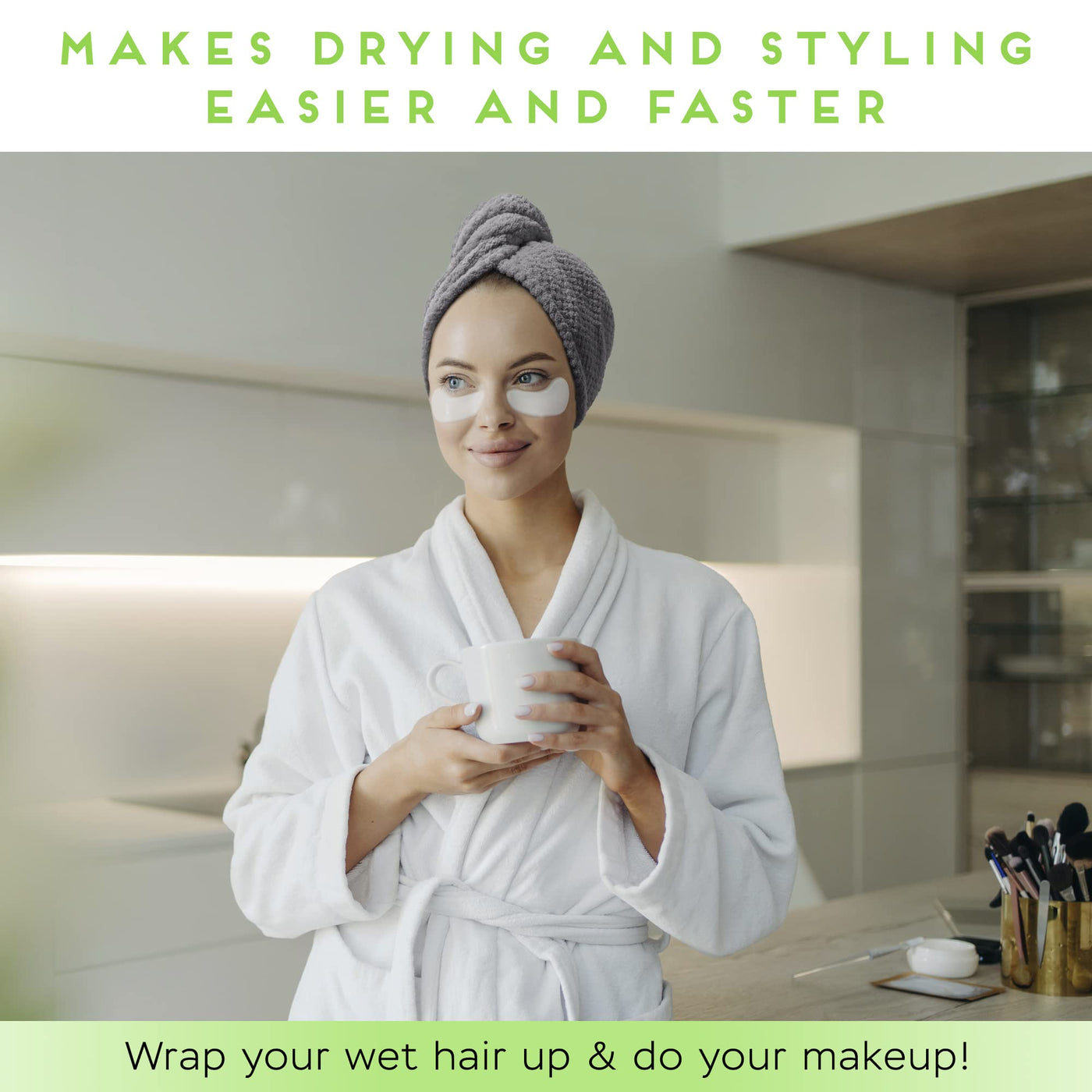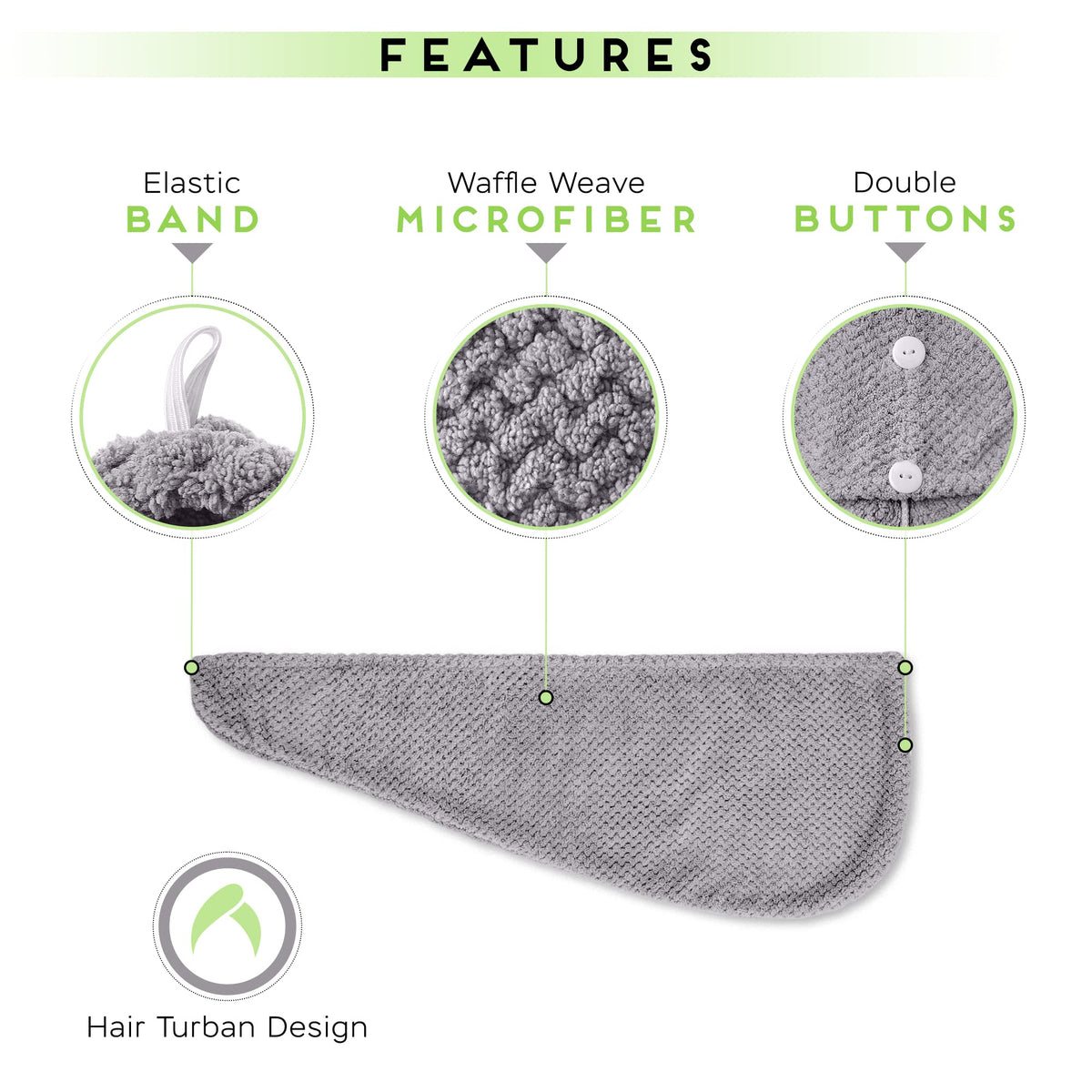 Q: How do I use the SimpleField Microfiber Hair Towel Wrap?A: To use the SimpleField Microfiber Hair Towel Wrap, simply place it over your wet hair, twist it into a turban shape, and secure it with the double buttons and elastic band for a comfortable fit. This allows you to wrap your hair while you do your makeup or get ready.