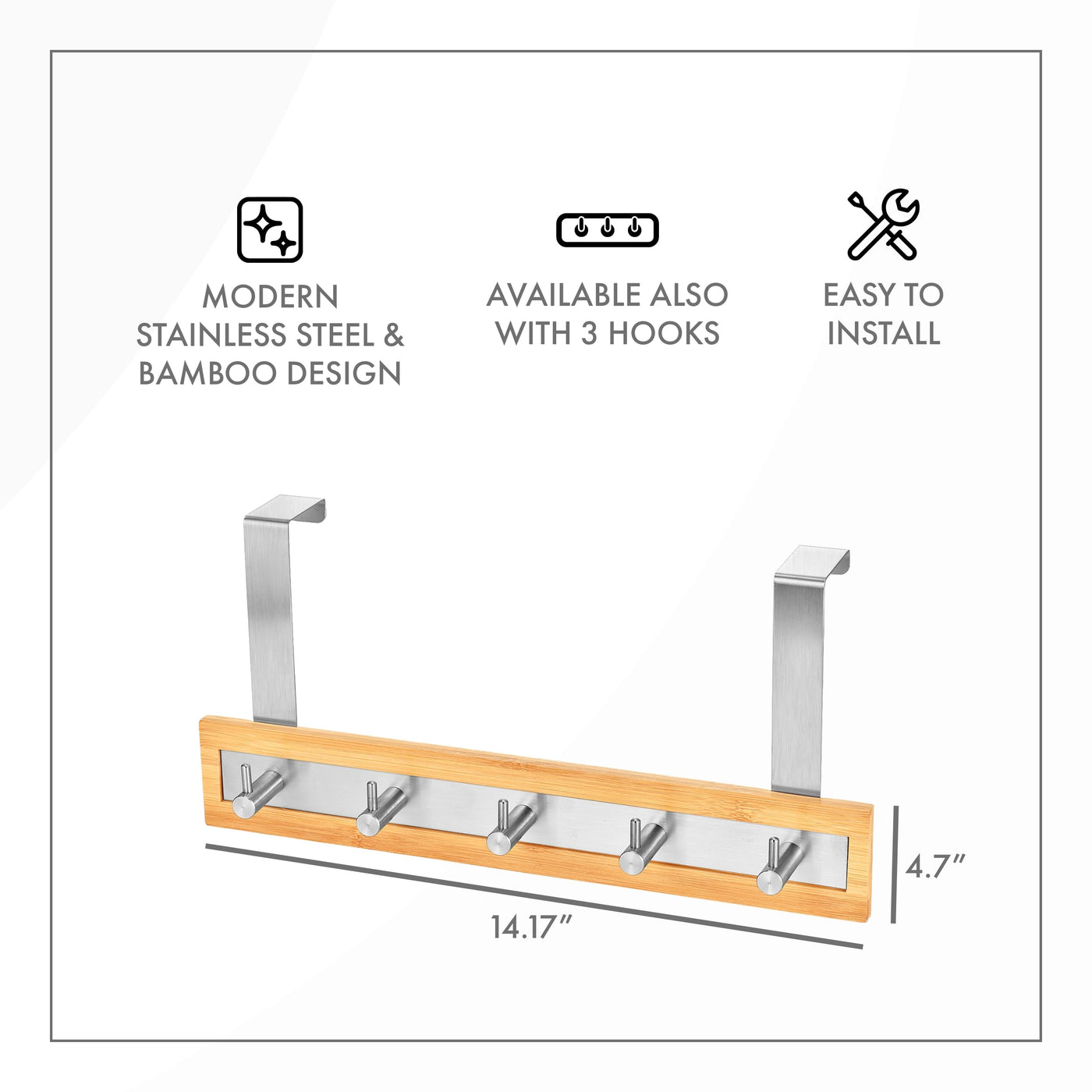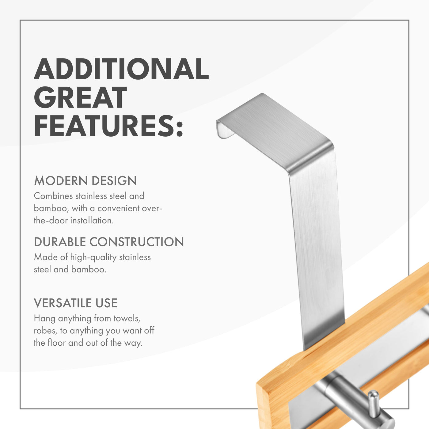 Toilettree Products Bamboo Stainless Steel Over-The-Door Towel Hooks - Durable Coat, Clothes, And Towel Rack To Use In The Bathr