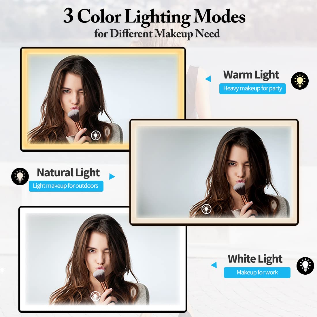 Q: What are the adjustable light settings on the mirror?A: This mirror is equipped with three adjustable light settings: cool, warm, and natural light. These settings allow you to simulate different lighting environments, helping you achieve the perfect look regardless of the time of day or location.