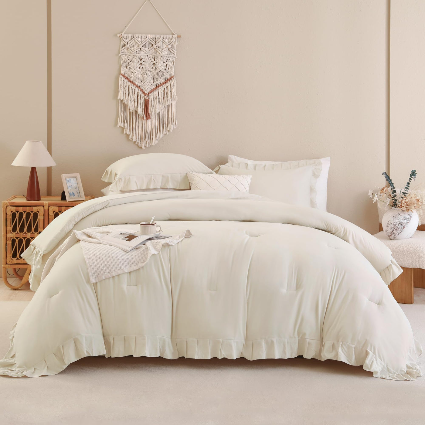 Andency Ruffle Comforter Set We are a professional manufacturer, aim to provide you comfortable and high-quality bedding sets. We have various styles of comforter sets: classic, unique, elegant style or farmhouse vintage style. You can definitely find one bedding set to meets your aesthetic taste. Why Choose Andency Ruffle Comforter Set? Beige Ruffle: The comforter creates a clean look, and the ruffle comforter is adopted a retro hem decorative pattern to show an elegant appearance and atmosphere. Soft Microfiber: Our stylish ruffled comforter is made of 100% premium quality microfiber, smooth and gentle to the touch. It will bring you a more breathable and lightweight feeling than a regular comforter. Exquisite Workmanship: Excellent stitching technology makes this shabby chic comforter durable, also a nice farmhouse room decor. Important is, the whole-piece polyfill prevents the filling from shifting, clumping. There is no concern about leakage or ripping. Great Gift: Andency chic ruffle comforter set will help you build an elegant house that full of vintage farmhouse looking, the ruffle comforter sets are a good choice as a birthday gift or special holiday gift to your friends and family. Machine washable: Machine washable in the gentle cycle with cold water separately. Air dry or tumble dry on low heat. Please do not bleach. Since the comforter is vacuum packaged, to completely fluff up this comforter, we suggest you expose it to the sunlight for a few hours and tapped it for fluffy.