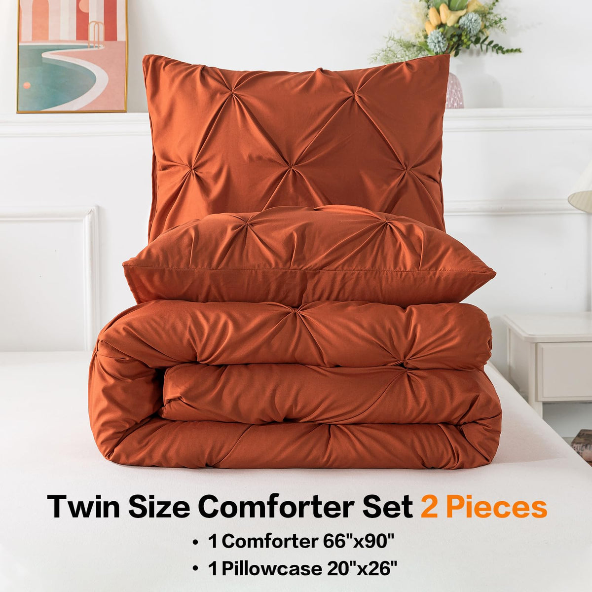 Andency Burnt Orange Pinch Pleat Comforter Twin(66X90Inch), 2 Pieces(1 Pintuck Comforter, 1 Pillowcase) Microfiber Pintuck Comforter Set Down Alternative Comforter Bedding Set