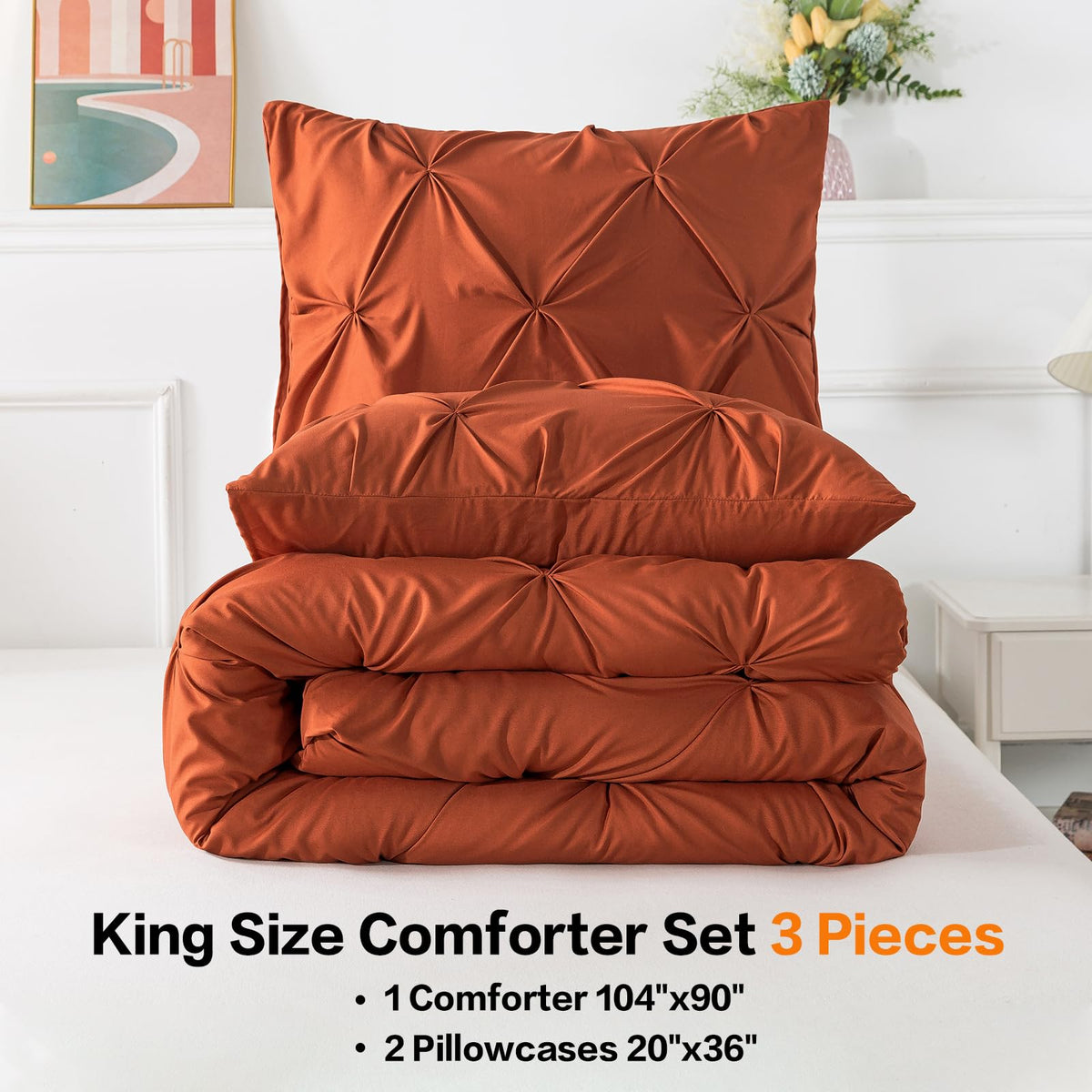 Andency Burnt Orange Terracotta King Size Comforter Set, 3 Pieces Pinch Pleat All Season Bedding Set, Soft Lightweight Microfiber Down Alternative Comforter Bed Set