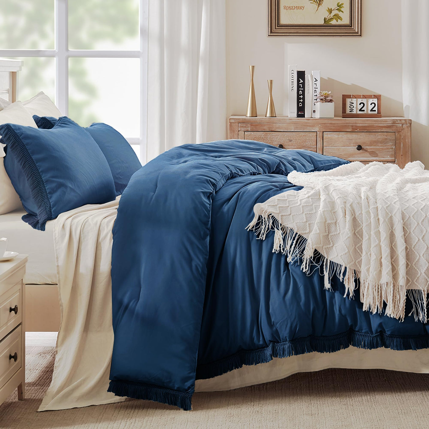 Andency Navy Blue Comforter King Size, 3 Pieces Boho Tassel Lightweight Bedding Comforter Sets For King Bed, All Season Soft Fluffy Fringe Bed Set (104X90In Comforter & 2 Pillowcases)