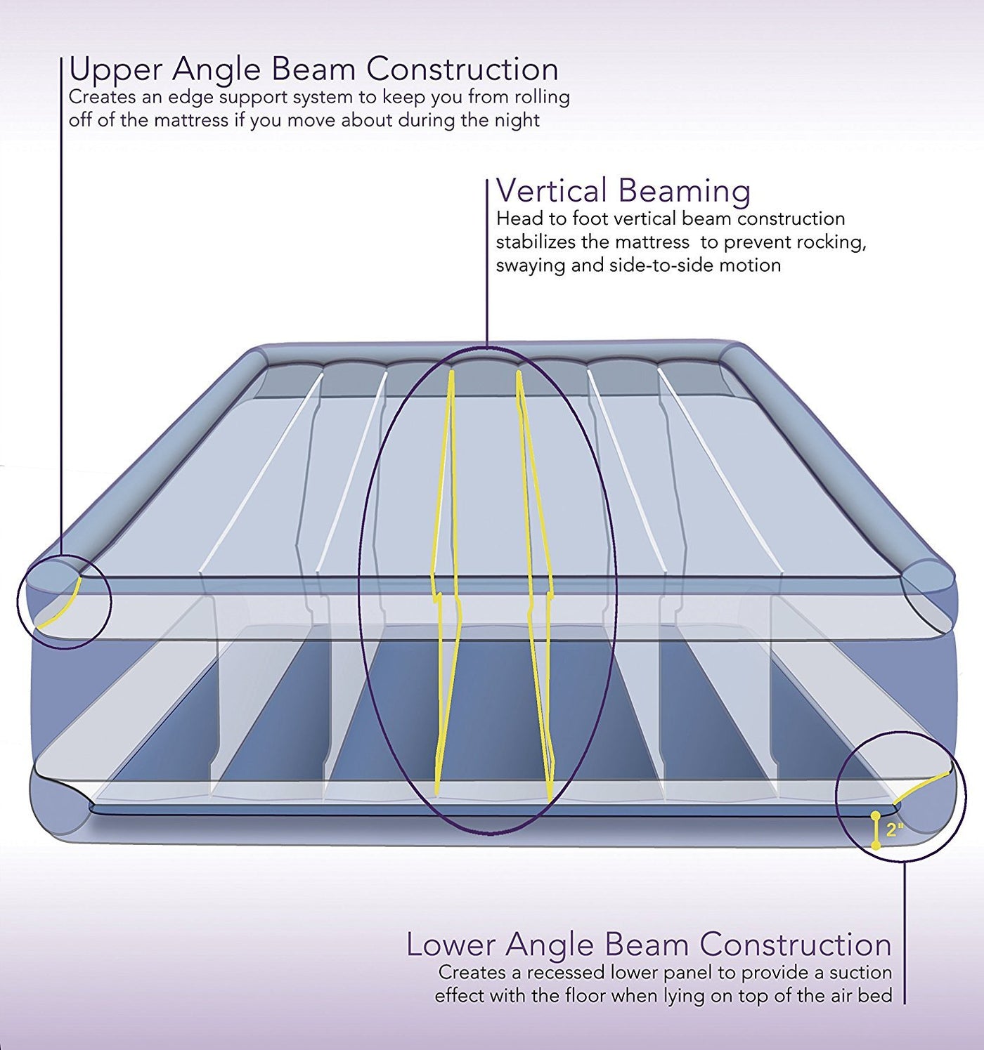 The Simmons Beautyrest Hi-Loft inflatable air mattress is the perfect solution for any time you need a sleep surface such as an extra bed, a planned camping or RV excursion, sleepover, or a guest bed; adjust from firm to plush with the touch of a button using one-touch control on side of mattress. Features a stable and vertical beam construction with built in edge support that prevents rocking, swaying, and side-to-side motion; provides bed like comfort and a peaceful, sleep. Includes electric express pump that inflates and deflates hands free within seconds; bonus adapter for other inflatables. Lower angle beam construction creates a 2" Recessed lower panel, providing a suction effect with the floor when lying on top of bed; upper angle beam construction creates an edge support system, keeping from rolling off the mattress when moving during the night. Plush Velveteen sleep surface prevents sheets from slipping and is made up of heavy duty puncture resistant vinyl; 100% leak tested. When not in use, Conveniently deflates and includes nylon carrying bag. The Simmons Beautyrest Hi-Loft inflatable air mattress fits standard size sheets and can be spot cleaned with water.