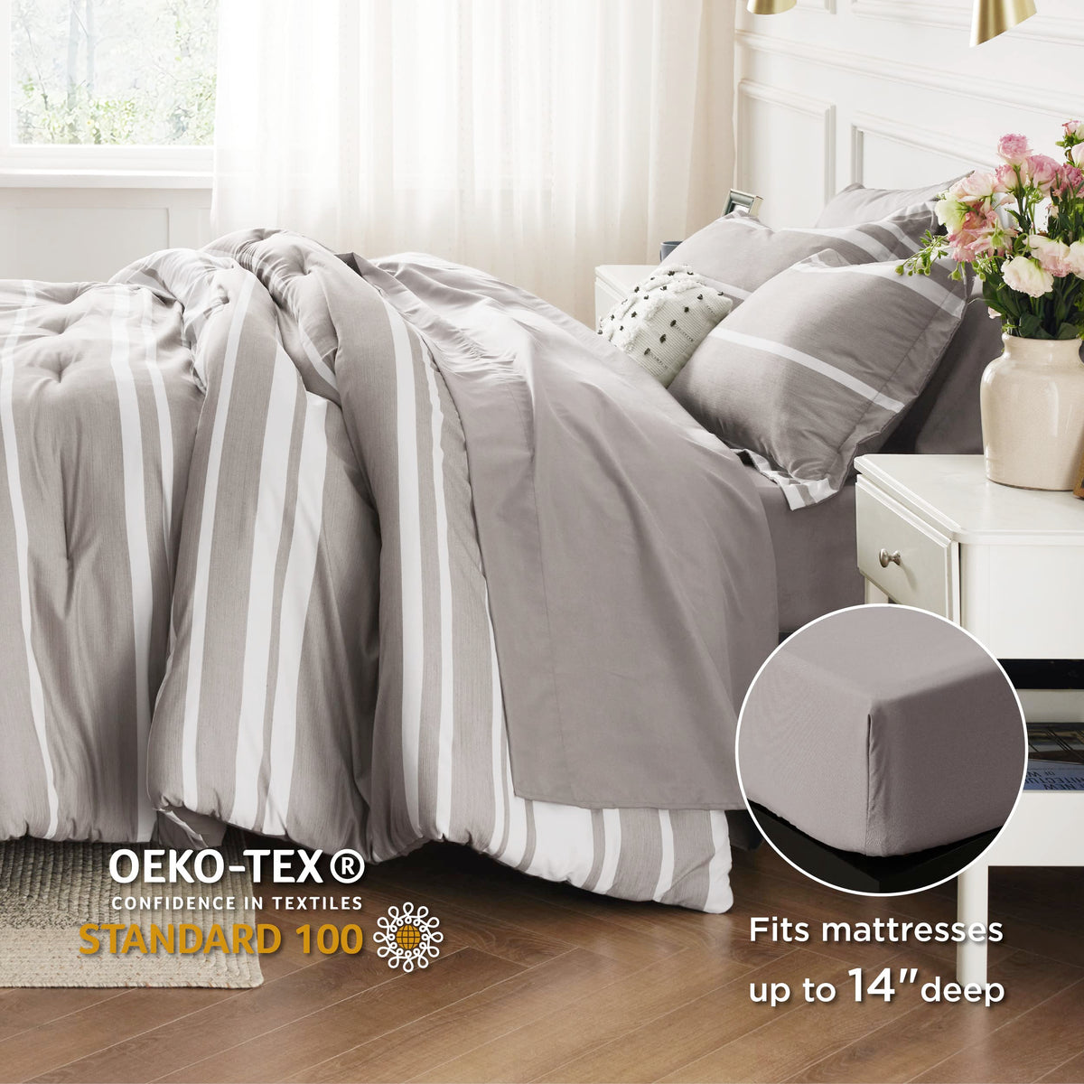 Bedsure bed-in-a-bag set includes a comforter, pillow shams, fitted sheet, flat sheet, and pillowcases. It is OEKO-TEX certified for safety, easy to care for, filled with high-quality fiber, and features a modern stripe design that adds aesthetic appeal to any bedroom.