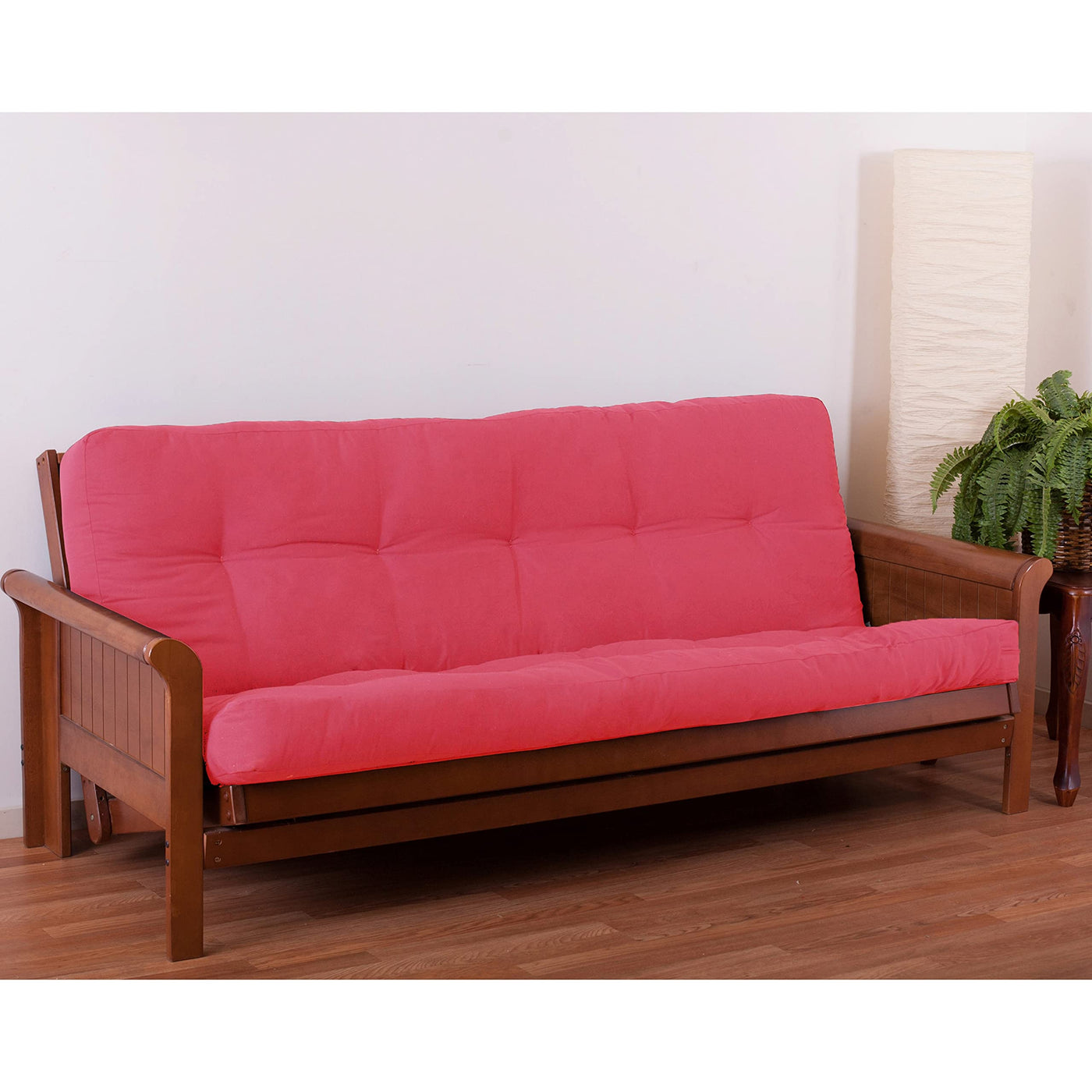 Add a splash of vibrant color & cushy comfort to your indoor furnishings with this 6-inch full-size futon. This futon features a two-layer foam core/cotton batting mattress design for maximum support & comfort & is available in a wide variety of colors of premium twill fabric. Available colors: aqua blue, berry, black, burgundy, chocolate, emerald, forest green, grape, hot pink, indigo, mojito lime, natural, navy, red, royal blue, ruby red, sage, spice, steel grey, sunset, tangerine dream, toffee.