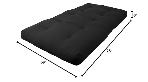 Add a splash of vibrant color and cushy comfort to your indoor furnishings with this 6-inch twin-size futon. This futon features a two-layer foam core/cotton batting mattress design for maximum support and comfort and is available in a wide variety of colors of premium twill fabric. Available colors: Aqua blue, berry, black, burgundy, chocolate, emerald, forest green, grape, hot pink, indigo, mojito lime, natural, navy, red, royal blue, ruby red, sage, spice, steel grey, sunset, tangerine dream, toffee.