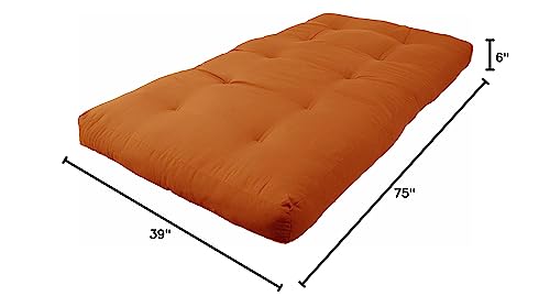 Add a splash of vibrant color and cushy comfort to your indoor furnishings with this 6-inch twin-size futon. This futon features a two-layer foam core/cotton batting mattress design for maximum support and comfort and is available in a wide variety of colors of premium twill fabric. Available colors: Aqua blue, berry, black, burgundy, chocolate, emerald, forest green, grape, hot pink, indigo, mojito lime, natural, navy, red, royal blue, ruby red, sage, spice, steel grey, sunset, tangerine dream, toffee.