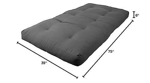 Add a splash of vibrant color and cushy comfort to your indoor furnishings with this 6-inch twin-size futon. This futon features a two-layer foam core/cotton batting mattress design for maximum support and comfort and is available in a wide variety of colors of premium twill fabric. Available colors: Aqua blue, berry, black, burgundy, chocolate, emerald, forest green, grape, hot pink, indigo, mojito lime, natural, navy, red, royal blue, ruby red, sage, spice, steel grey, sunset, tangerine dream, toffee.