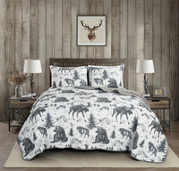 Chezmoi Collection Denver 3-Piece Southwestern Lodge Quilt Set King - White Black Gray Grizzly Bear Wolves Moose Pine Tree Mount