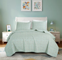 Chezmoi Collection Thistle 3-Piece Tranquil Floral Quilt Set Queen - Soft Green White Floral Printed Microfiber Lightweight Beds