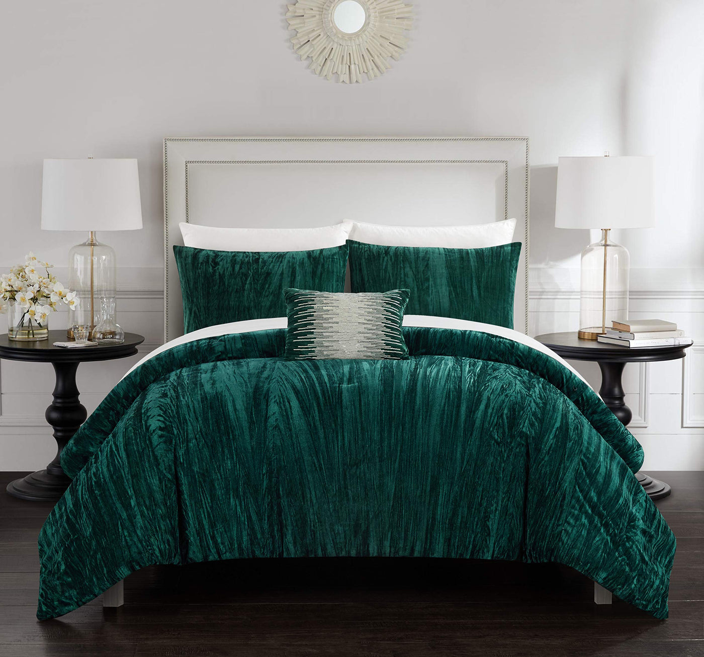 A Statement-Making Comforter Set With Just What You Need For A Quick Bedroom D Cor Makeover. The Comforter Features A Rich, Textured Crinkle Crushed Velvet Face With A Solid Matching Color Backing. Design Coordinated Shams And A Sequin Decorative Throw Pillow Are Included To Complete The Look. Specifications: Size: Queen Color Scheme: Green Piece Count: 4 Set Includes: 1Pc Comforter (90 X 92 ) 2Pc Pillow Shams (20 X 26 + 2 ) 1Pc Sequin Decorative Pillow (12 X 18 ) Materials: Crinkle Crushed Velvet, Luxuriously Brushed Microfiber Fabric, Hypoallergenic Synthetic Down Alternative Filling Fabric And Design: Luxurious Crinkle Crushed Velvet Fabric Rich, Multidimensional Textured Crinkle Velvet On The Face With A Solid Matching Color Microfiber Backing Features: Luxuriously Soft Feel For A Great Night Sleep With Less Tossing And Turning Hypoallergenic Alternative Down Filling Is Perfect For Those Allergic To Traditional Down Materials Built To Last With Premium Fabrics And Expert Stitching Care Instructions Dry Clean Preferred. Machine Washable, Use Front Loader Machine (Or Top Loader Without Agitator) To Avoid Tearing, Use Cold Water On Gentle Cycle, Tumble Dry Low * Add 2 Tennis Balls To The Dryer To Speed Up Drying And Add Fluffiness The Digital Images We Display Have The Most Accurate Color Possible. However, Due To Differences In Computer Monitors, We Cannot Be Responsible For Variations In Color Between The Actual Product And Your Screen.
